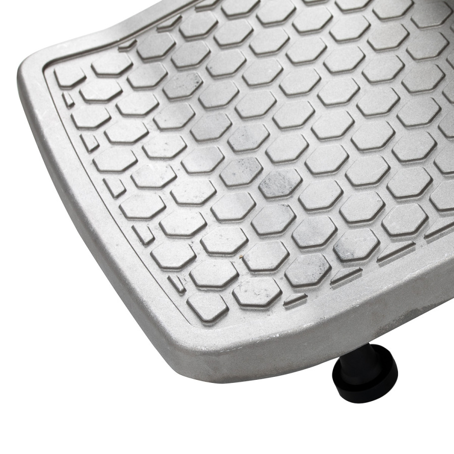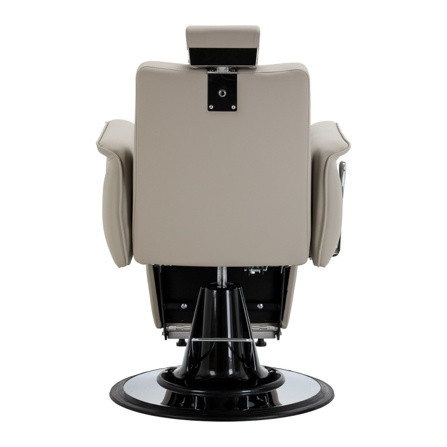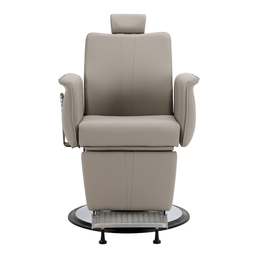 Stabilná okrúhla základňa s kovovou povrchovou úpravou zabezpečuje spoľahlivú oporu a bezpečnosť používania. Sedadlo, operadlo a opierka nôh sú vyplnené penou odolnou proti deformácii a čalúnené šedou syntetickou kožou príjemnou na dotyk, čo zaručuje odolnosť a vysoký komfort používania . Použité materiály sú odolné voči vlhkosti a ľahko sa čistia, vďaka čomu je stolička ideálna na každodenné používanie. Tlmené farby a klasický tvar jej umožňujú harmonicky zapadnúť do interiéru moderných aj tradičných holičstiev.