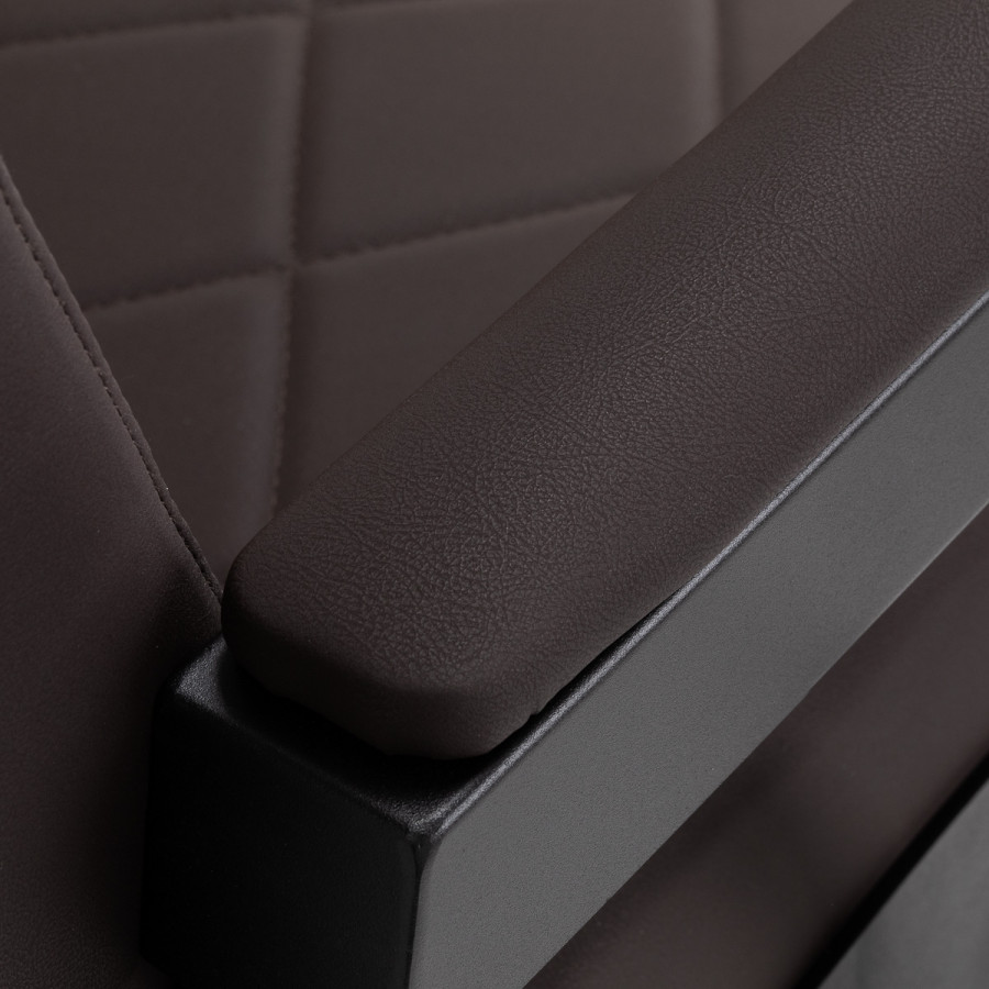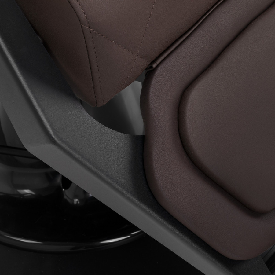 Stabilná konštrukcia zaručuje bezpečnosť a dlhodobú životnosť. Sedadlo vyplnené penou odolnou voči deformáciám a čalúnenie z mäkkej syntetickej kože zaisťujú odolnosť a pohodlie. Materiály odolné voči vlhkosti sú nielen odolné, ale aj ľahko sa čistia. Hnedé čalúnenie v kombinácii s čiernym rámom dodáva stoličke moderný a profesionálny vzhľad, pričom jej minimalistický štýl umožňuje, aby zapadla do interiéru každého holičstva.