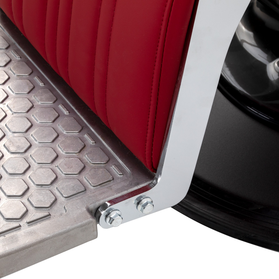 Stabilná základňa poskytuje bezpečnú oporu a vysoký komfort používania. Sedadlo je vyplnené penou odolnou proti deformácii a čalúnené matnou syntetickou kožou, čo zaručuje dlhodobú odolnosť a pohodlie. Materiály sa vyznačujú odolnosťou proti vlhkosti a ľahkým čistením. Burgundské čalúnenie v kombinácii s kovovými chrómovými prvkami a dekoratívnou opierkou na nohy dodávajú stoličke výrazný, klasický charakter. Vertikálne prešívanie zdôrazňuje vintage štýl, ktorý perfektne zapadá do atmosféry profesionálnych holičstiev. Starostlivo prepracované detaily dodávajú celku reprezentatívny vzhľad a funkčný dizajn podporuje pohodlnú a efektívnu prácu.