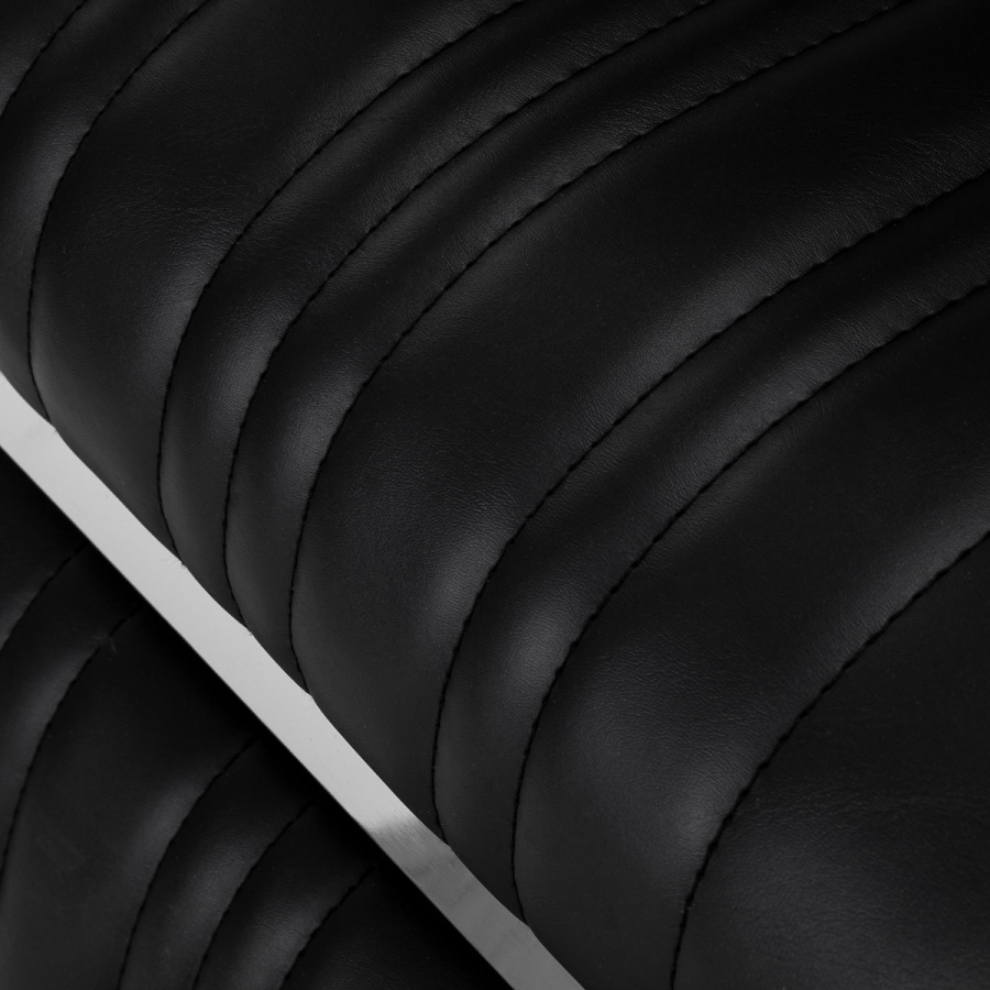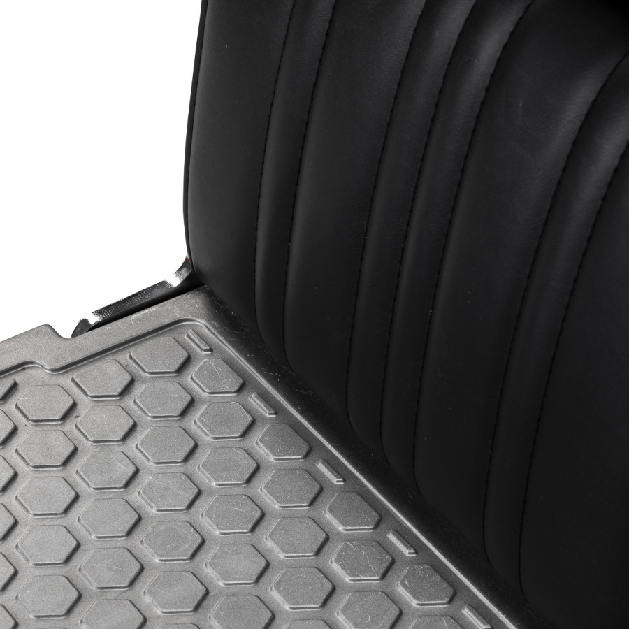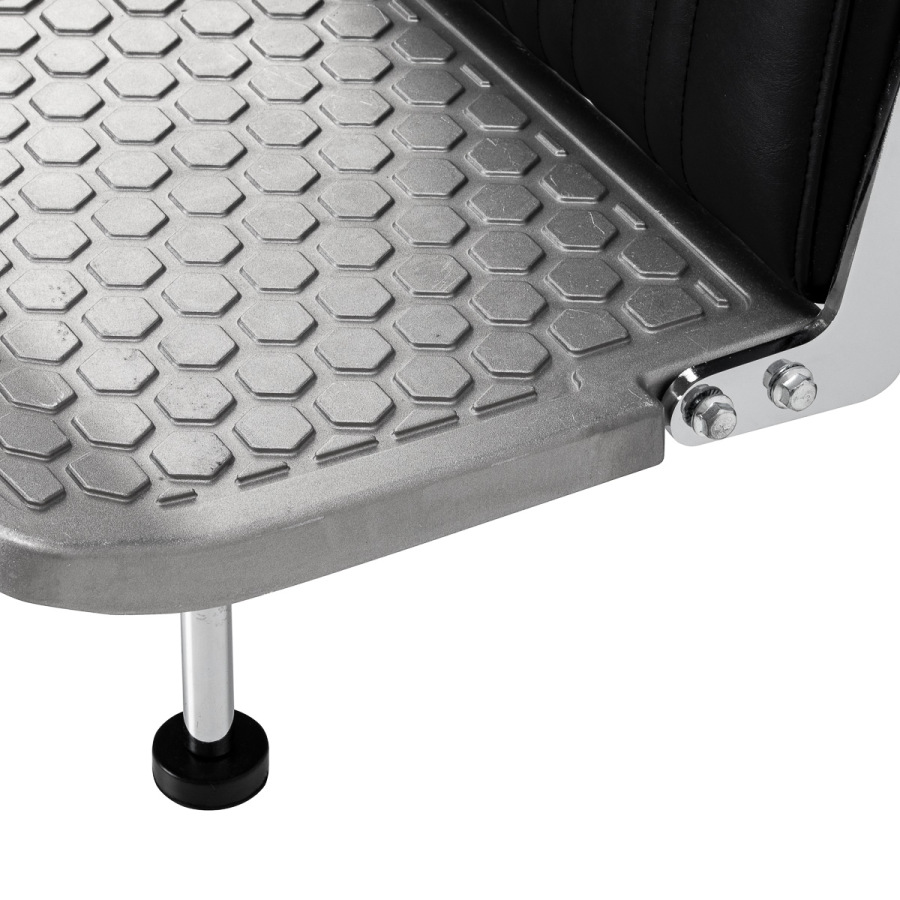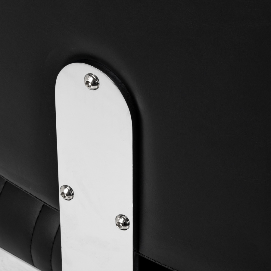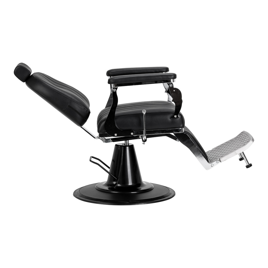 Stabilná základňa poskytuje bezpečnú oporu a vysoký komfort používania. Sedadlo je vyplnené penou odolnou proti deformácii a čalúnené polomatnou syntetickou kožou, čo zaručuje dlhodobú odolnosť a pohodlie. Materiály sa vyznačujú odolnosťou voči vlhkosti a ľahkou údržbou. Čierne čalúnenie v kombinácii s kovovými chrómovanými prvkami a dekoratívnou opierkou na nohy dodávajú stoličke výrazný, klasický charakter. Vertikálne prešívanie zdôrazňuje vintage štýl, ktorý perfektne zapadá do atmosféry profesionálnych holičstiev. Starostlivo prepracované detaily dodávajú celku reprezentatívny vzhľad a funkčný dizajn podporuje pohodlnú a efektívnu prácu.