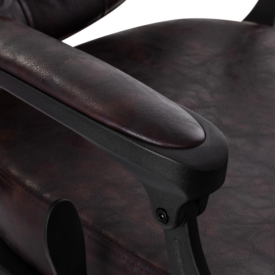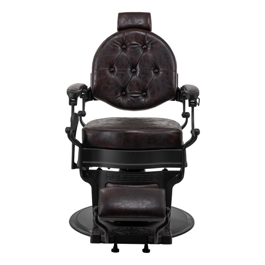 Pevná konštrukcia základne zaručuje stabilitu a vysoký komfort. Výplň sedadla z odolnej peny odolnej voči deformáciám a čalúnenie z na dotyk príjemnej syntetickej kože s polomatnou povrchovou úpravou zaručujú odolnosť nábytku a jeho pohodlné používanie po dlhú dobu. Vďaka nim je zariadenie tiež odolné voči vlhkosti, trvácne a ľahko sa čistí. Poťah v odtieňoch hnedej farby s prešívaním a ozdobnými gombíkmi mu dodáva jedinečný charakter. Kreslo s výrazným vintage dizajnom dokonale zapadá do atmosféry holičstiev a podčiarkuje ich jedinečnú atmosféru.