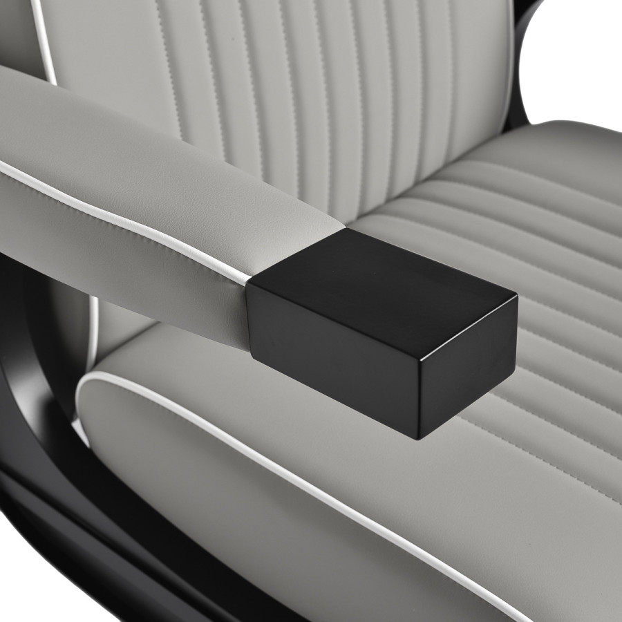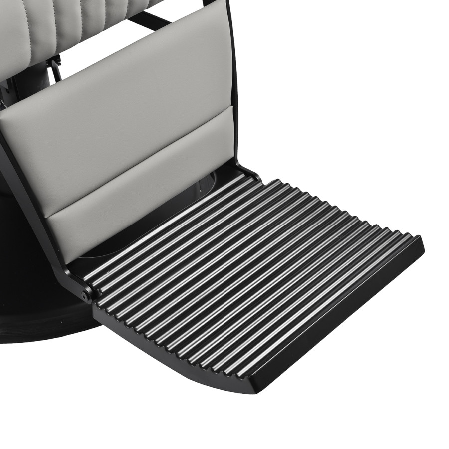 Čierna okrúhla základňa zaručuje stabilitu a odolnosť. Mäkké matné čalúnenie zo syntetickej kože spája pohodlie s odolnosťou. Použité materiály sú odolné voči vlhkosti, trvanlivé a ľahko sa čistia. Štýlové prešívanie a čalúnenie v sivom odtieni mu dodávajú jedinečný charakter a dokonale dopĺňajú interiér moderných holičstiev. Kombinácia elegantnej farby čalúnenia s čiernym rámom a podstavcom zdôrazňuje moderný, profesionálny vzhľad kresla.