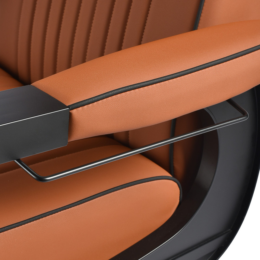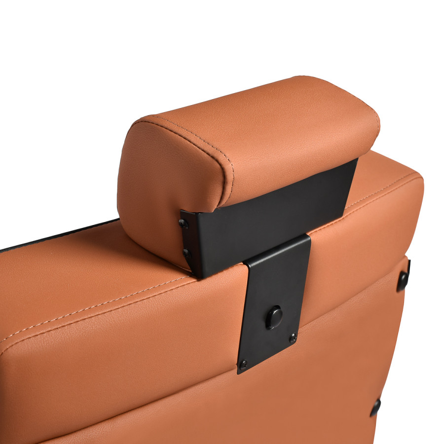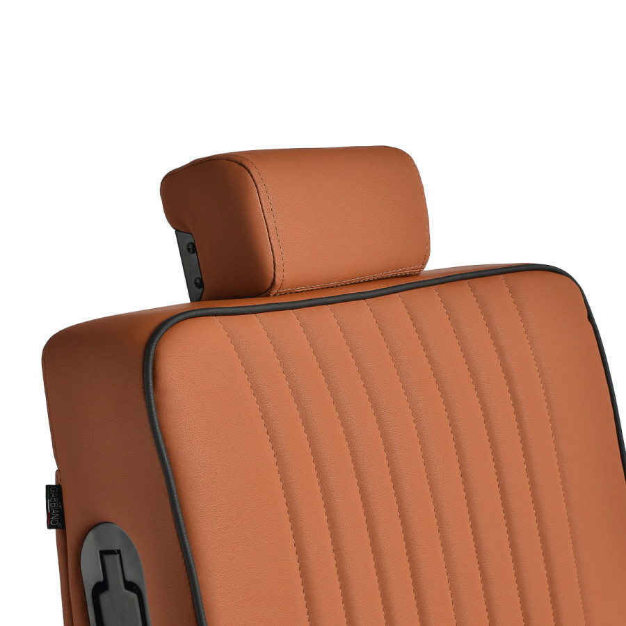 Čierna okrúhla základňa zaručuje stabilitu a odolnosť. Mäkké matné čalúnenie zo syntetickej kože spája pohodlie s odolnosťou. Použité materiály sú odolné voči vlhkosti, trvanlivé a ľahko sa čistia. Štýlové prešívanie a čalúnenie v hnedom odtieni mu dodávajú jedinečný charakter a dokonale dopĺňajú interiér moderných holičstiev. Kombinácia elegantnej farby čalúnenia s čiernym rámom a podstavcom zdôrazňuje moderný, profesionálny vzhľad kresla.