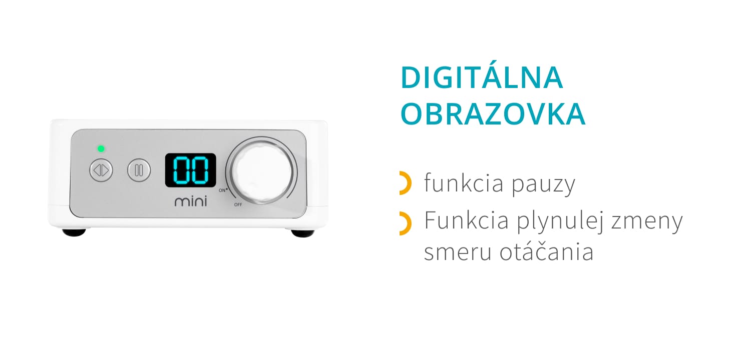 Bruska na nehty je vybavená prehľadným ovládacím panelom s digitálnym displejom, ktorý zohráva kľúčovú úlohu pri monitorovaní a riadení prevádzky stroja. Na displeji sa zobrazuje rýchlosť, ktorou práve pracuje hlava prístroja, aby sa zabezpečila presná a bezpečná prevádzka frézky. Nastavenie rýchlosti pomocou voliča je možné až do 30 000 otáčok za minútu, čo umožňuje prispôsobenie, a teda pohodlné vykonávanie širokého spektra ošetrení. Systém plynulého zmenenia smeru otáčania s integrovanou pauzou zaručuje bezpečný a komfortný prechod medzi oboma pracovnými smermi. Okrem toho LED dióda smeru otáčania svieti zelenou alebo červenou farbou, čo uľahčuje identifikáciu smeru frézy. Ovládací panel je vybavený aj funkciou pauzy, ktorá umožňuje používateľovi zastaviť prevádzku stroja pre lepšiu kontrolu nad procesom. Vďaka použitým riešeniam je ovládanie frézky intuitívne a veľmi efektívne.