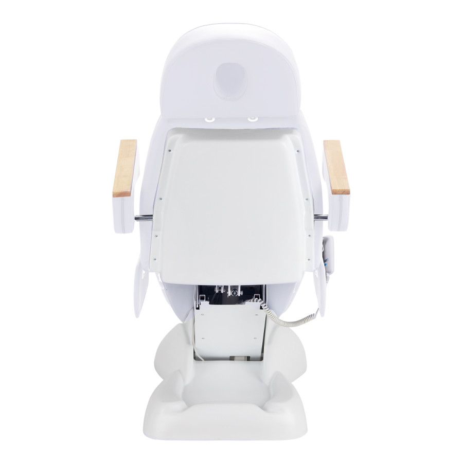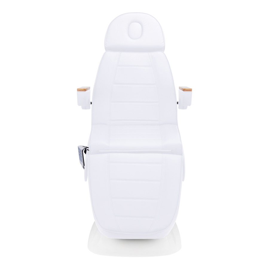 Kreslo je vyplnené penou primeranej tvrdosti a potiahnuté na dotyk príjemnou imitáciou kože v odtieňoch bielej farby. Vďaka použitiu materiálu, ktorý sa ľahko udržiava v čistote a je odolný voči vybraným dezinfekčným prostriedkom, je zariadenie pohodlné na používanie, odolné voči vlhkosti a nekomplikované na čistenie. Pevná základňa z odolného materiálu v odtieňoch bielej farby zabezpečujestabilitu počas ošetrenia. Ozdobné drevené prvky na podrúčkach odlišujú kreslo od ostatných modelov a poskytujú vizuálne príťažlivý, elegantný akcent. Vhodne tvarované čalúnenie dodáva kreslu štýlový vzhľad a umožňuje ergonomické sedenie.