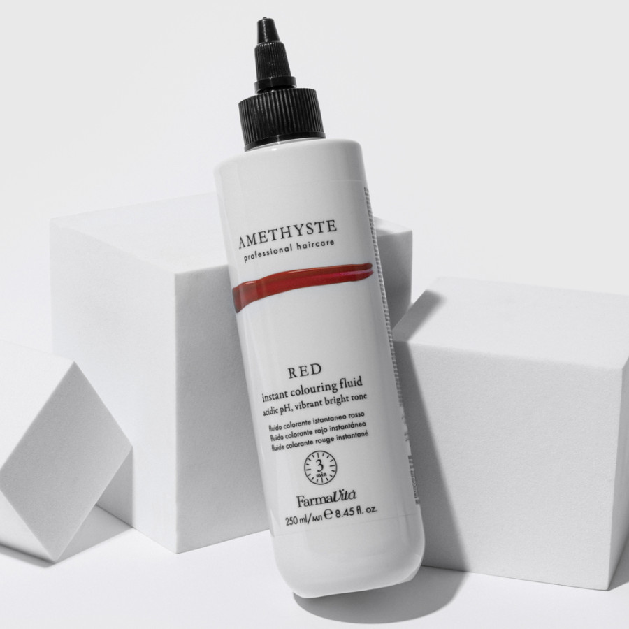 Profesionálny FARMAVITA Amethyste Instant Colouring Fluid Red je polopermanentný farbiaci fluid určený na oživenie a prehĺbenie červených odtieňov vlasov.