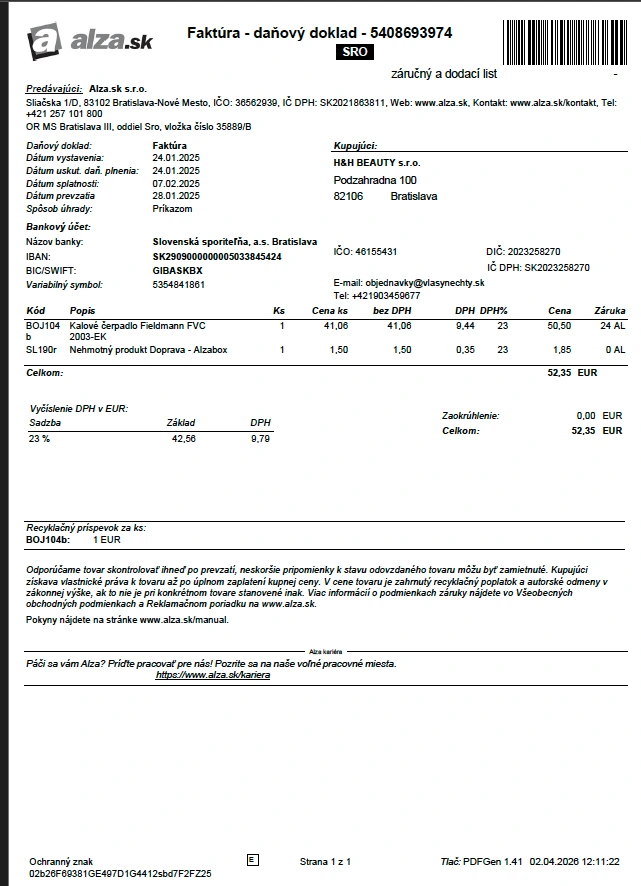 Kalové čerpadlo FIELDMANN FVC 2003-EK je univerzálne čerpadlo, ktoré je určené na čerpanie znečistenej vody. Elektrický motor ponúka výkon 400 W a poháňa čerpadlo, ktoré je schopné prečerpať až 7 500 litrov za hodinu. Maximálna ponorná hĺbka je 5 m a výtlak čerpadla až 6 m. Kvapalina môže obsahovať pevné prímesi do veľkosti 25 mm. Plavákový spínač zaisťuje automatické zapnutie čerpadla pri dosiahnutí určitej úrovne kvapaliny a jeho vypnutie pri poklese hladiny pod stanovenú hranicu. Hraničné hodnoty možno čiastočne upraviť nastavením spínača. Prívodný kábel s dĺžkou 10 metrov je dostatočne dlhý na potrebnú manipuláciu. K čerpadlu možno pripojiť 1" (25 mm) alebo 1 – 1/4" (32 mm) hadicu, prípadne 1" prípojku so závitom.
