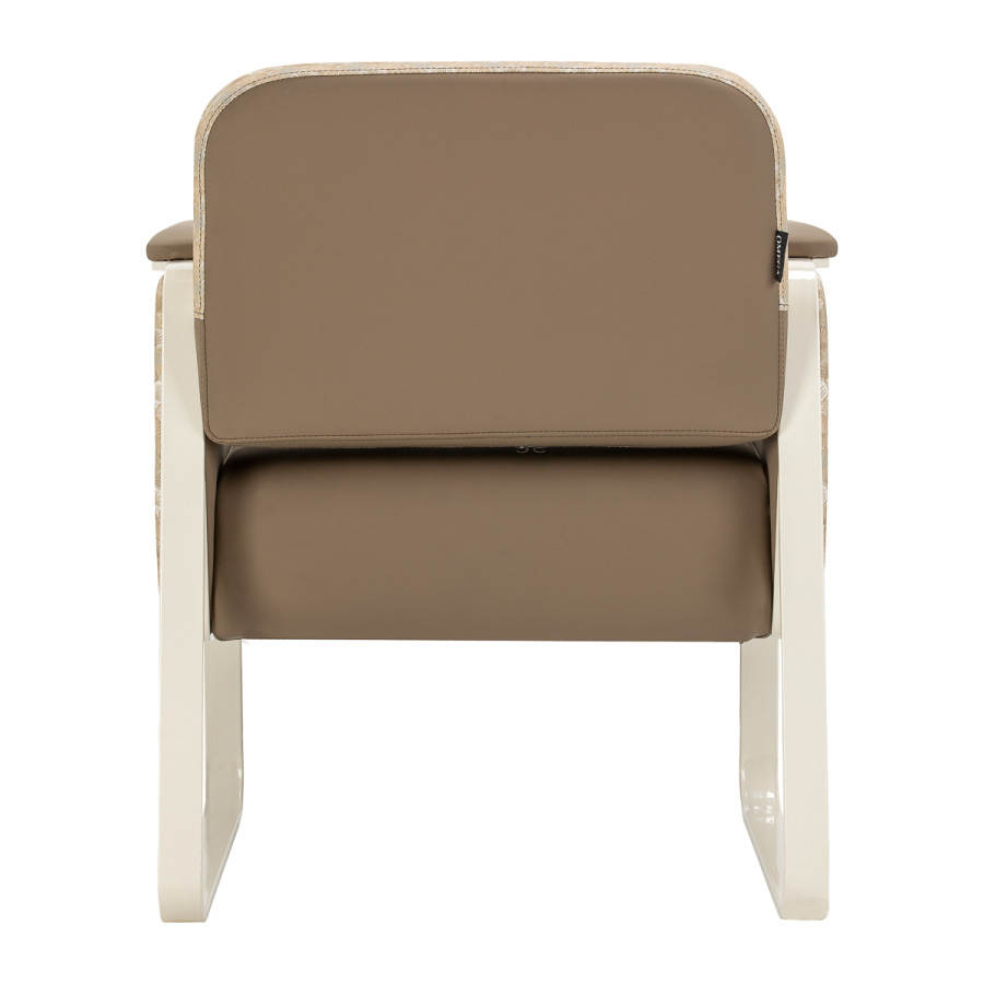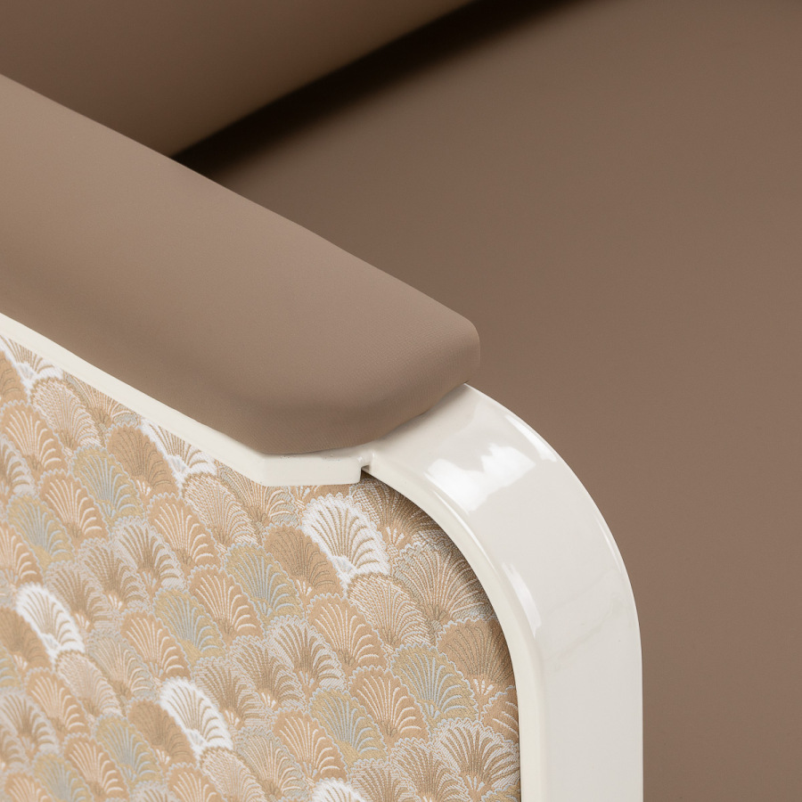 Fotel wykonany jest z trwałej skóry syntetycznej w eleganckim jasnobrązowym kolorze. Materiał obicia wyróżnia się odpornością na wilgoć oraz łatwością utrzymania w czystości, dzięki czemu mebel przez długi czas zachowuje estetyczny wygląd. Stabilna metalowa konstrukcja w jasnym odcieniu idealnie współgra z kolorystyką tapicerki. Inspirowany stylem Art Déco ozdobny wzór zewnętrznej części nadaje meblowi wyjątkowego charakteru i przyciąga uwagę, podkreślając styl wnętrza.