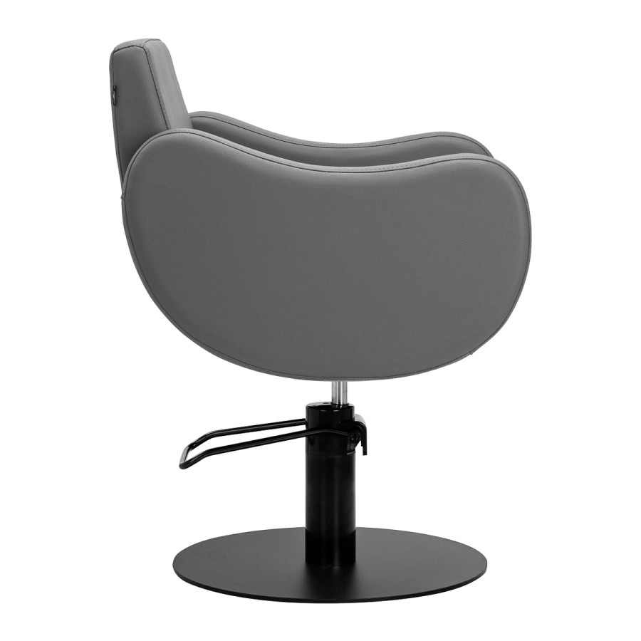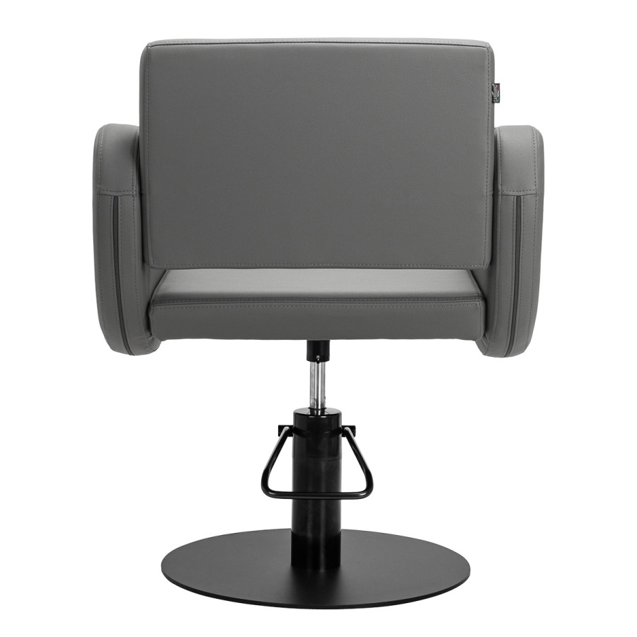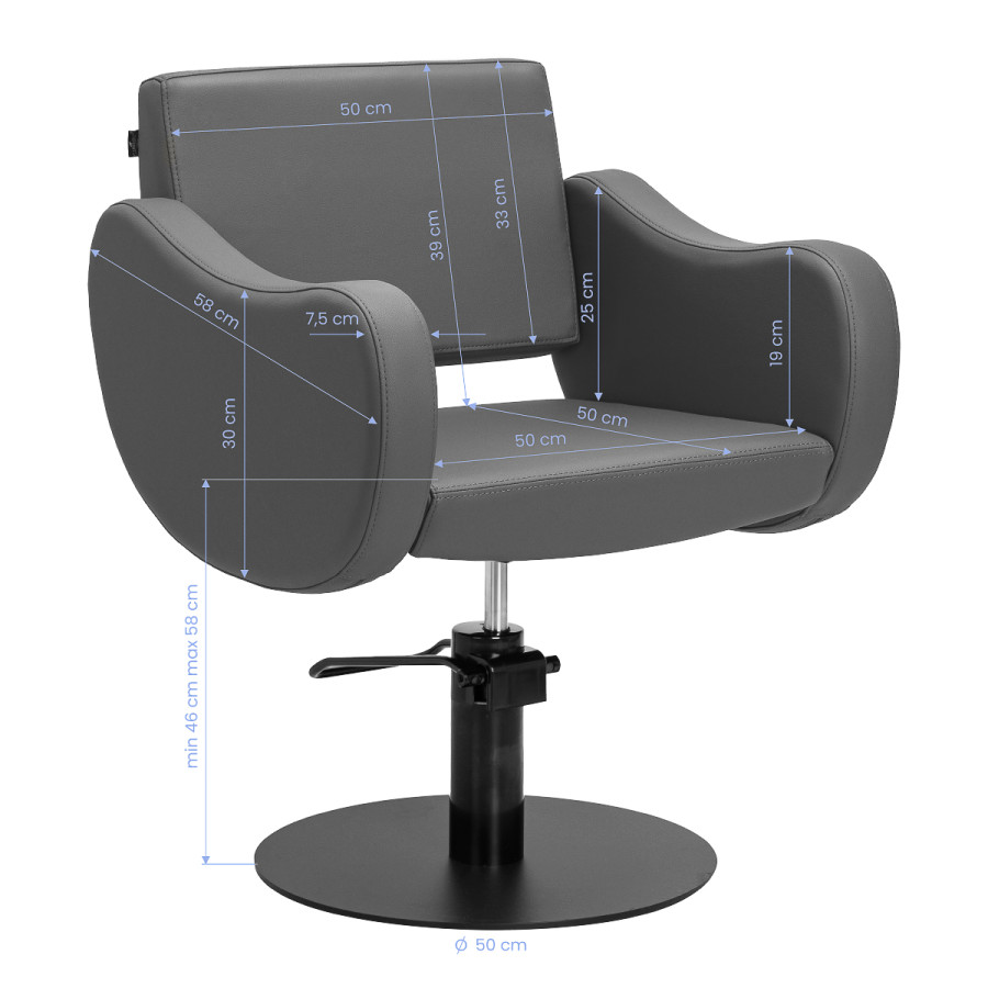Kadernícke kreslo Gabbiano Sewilla spája minimalistický dizajn s pohodlím každodenného používania. Stabilná okrúhla základňa v matnej čiernej farbe jej dodáva elegantný vzhľad, zatiaľ čo penové polstrovanie a na dotyk mäkká syntetická koža v odtieňoch sivej s matnou povrchovou úpravou zabezpečujú vysoký komfort. Použité materiály sú odolné, odolné voči vlhkosti a ľahko sa čistia. Výborne sa bude hodiť do moderných aj klasických interiérov a podčiarkne profesionálny štýl interiéru.