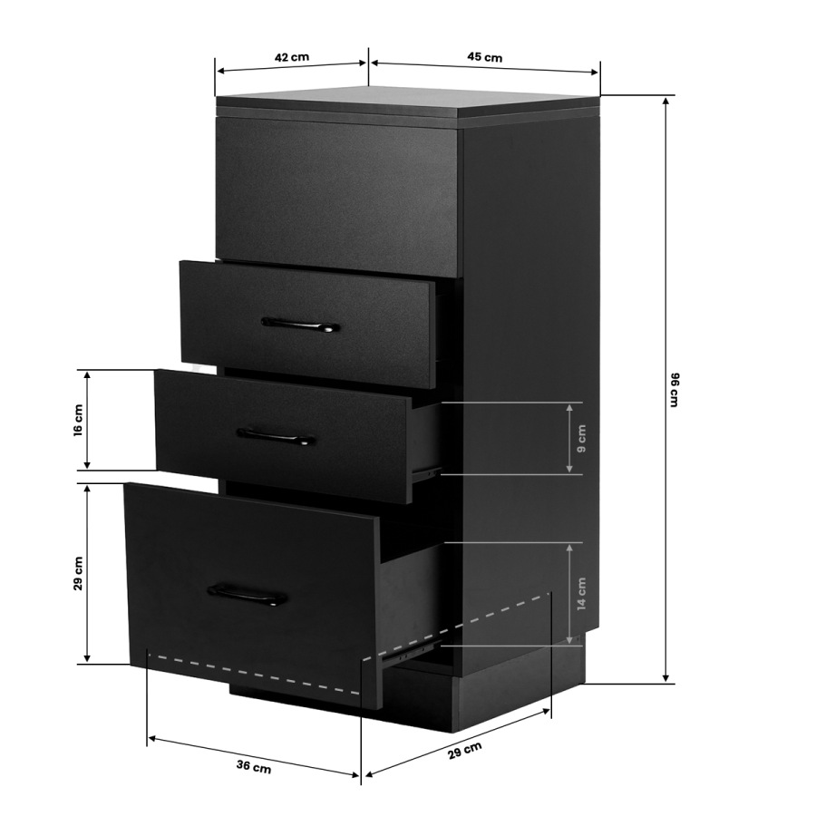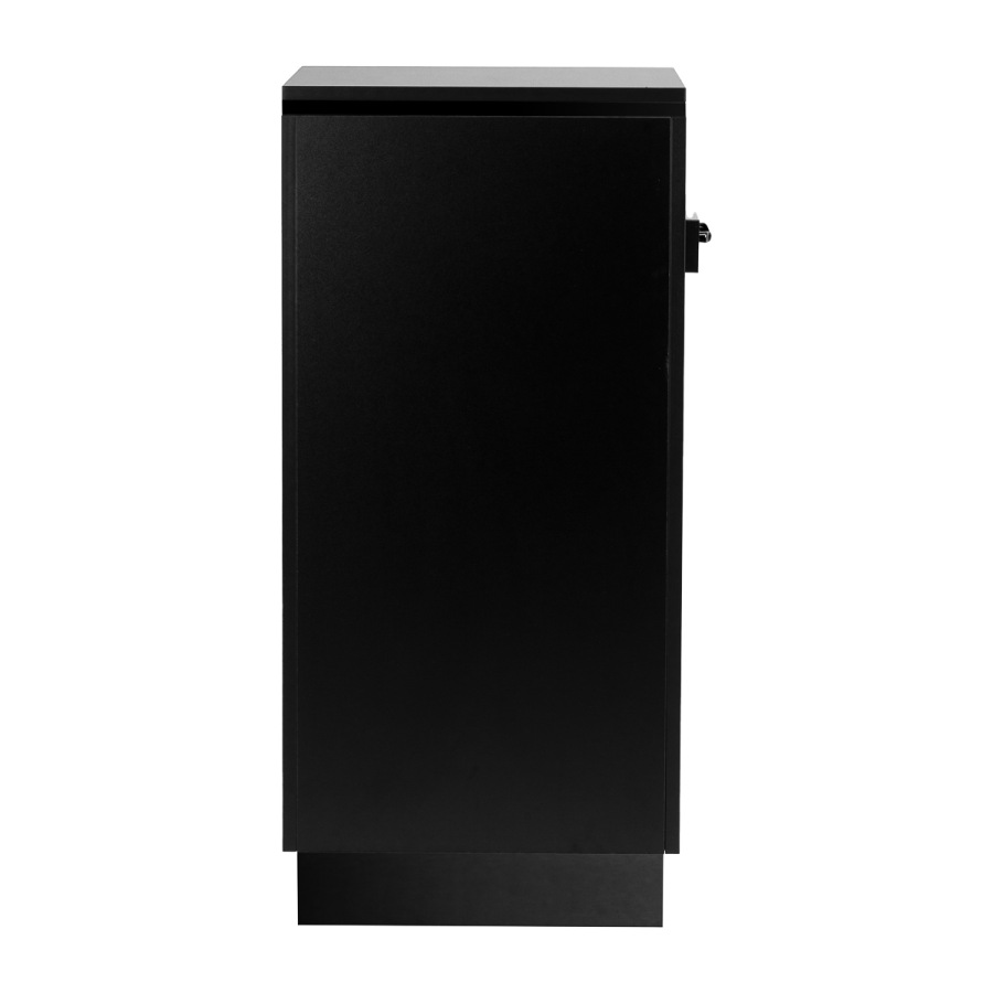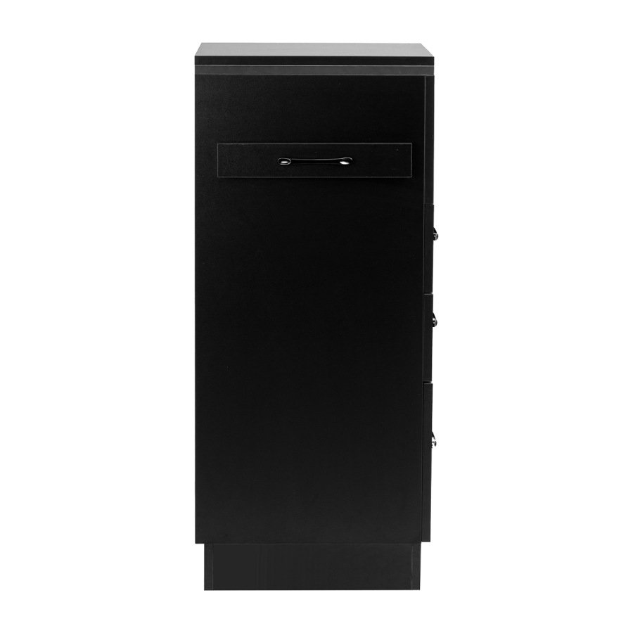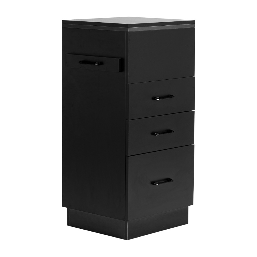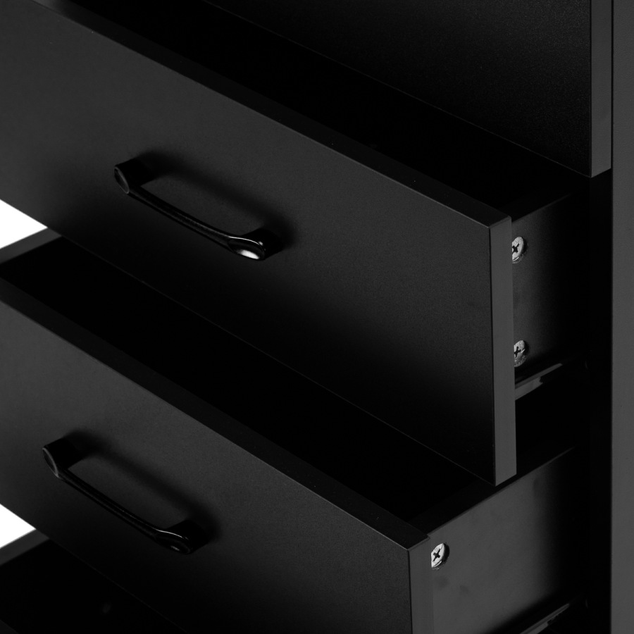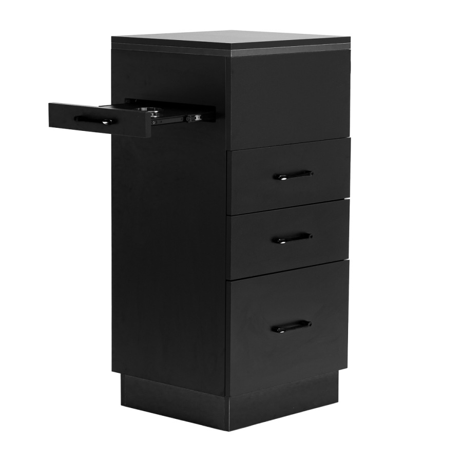 Spojenie klasickej čiernej farby dodáva pomocníkovi moderný, prestížny charakter, ktorý sa dokonale hodí do minimalistických aj výraznejších úprav. Pevná konštrukcia zaručuje stabilitu, zatiaľ čo hladký povrch uľahčuje udržiavanie čistoty nábytku. Čierne úchyty nielenže podčiarkujú elegantný dizajn, ale zabezpečujú aj pohodlné otváranie každej zásuvky. Je to praktické riešenie pre kadernícky salón, kde záleží na poriadku, pohodlnom prístupe k nástrojom a estetike pracoviska.