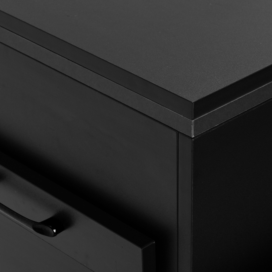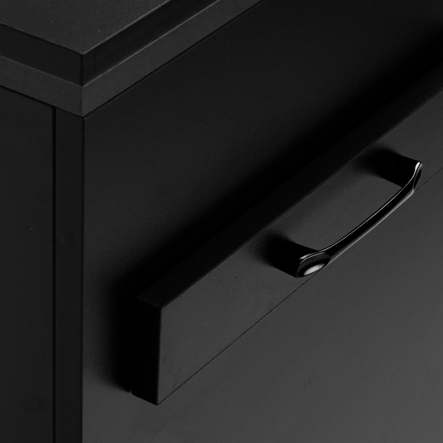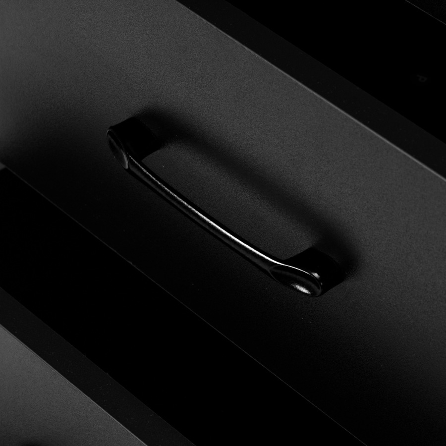 Pevná konštrukcia zaručuje stabilitu, hladký povrch umožňuje jednoduché čistenie a čierne úchyty podčiarkujú elegantný dizajn a zároveň zabezpečujú pohodlné otváranie zásuviek.