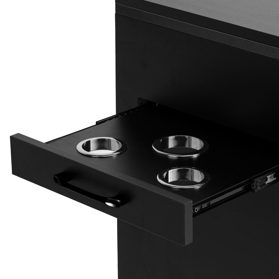 Pomocník má navyše bočnú výsuvnú zásuvku s kovovými držiakmi na náradie. Tri otvory sú ideálne na uloženie fénov, kuliem, žehličiek na vlasy alebo kief, čo vám umožní pohodlne uložiť vybavenie počas ošetrenia. Toto riešenie poskytuje voľný prístup k najpotrebnejším nástrojom bez toho, aby ste ich museli odkladať na pracovnú plochu.