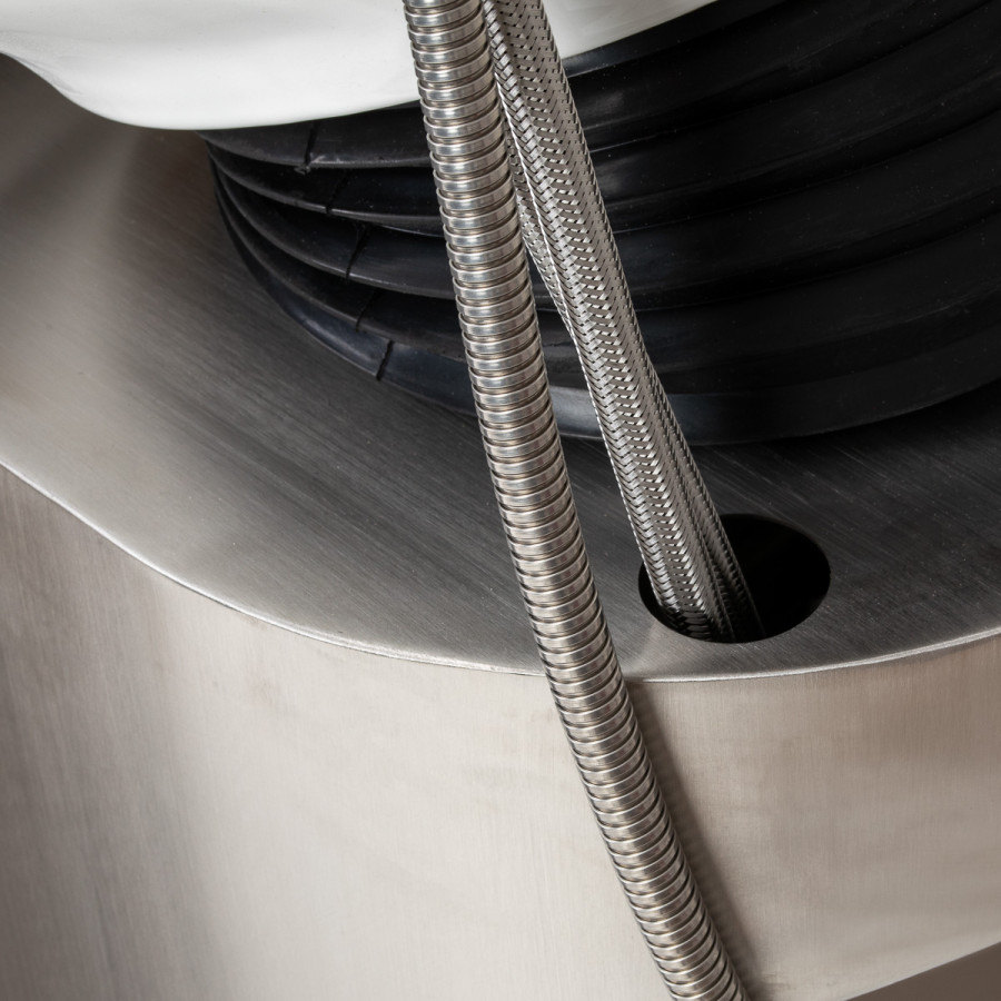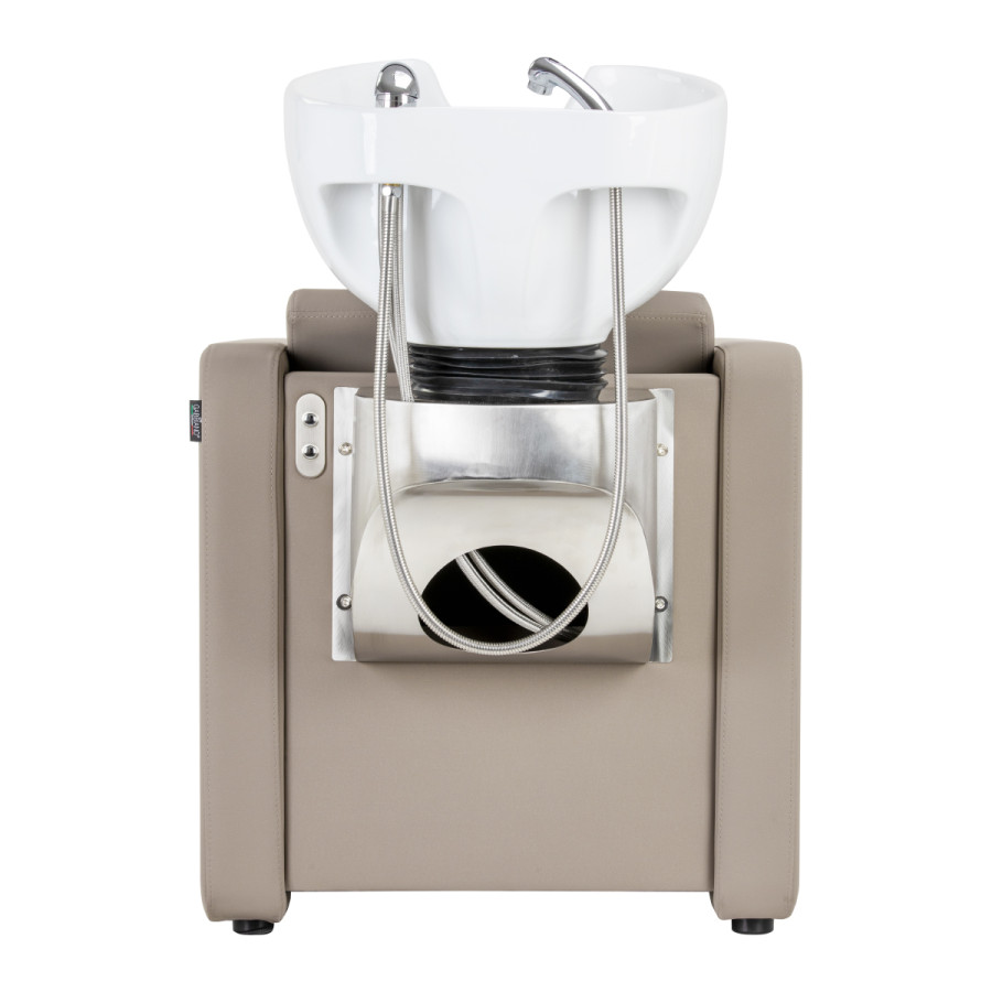 Šampón je vybavený zmiešavacou batériou, ktorá zabezpečuje stály prístup k teplej a studenej vode. Vďaka tomu možno teplotu ľahko nastaviť podľa preferencií zákazníka. Vyhradené miesto na odloženie slúchadla uľahčuje prácu a pochrómovaná zátka so špeciálnym sitkom umožňuje kontrolovať prietok vody a udržiavať vysoké hygienické štandardy v salóne. Prípojka vody bola umiestnená vo vnútri stĺpa pod umývadlom, čo umožňuje efektívne skryť všetky potrubia, pričom ľahko odnímateľný panel poskytuje v prípade potreby bezproblémový prístup. Kreslo je tvarované pre pohodlie počas rôznych ošetrení a opierka na nohy poskytuje vynikajúcu oporu nôh. Vďaka kombinácii funkčnosti a pohodlia bude práca v kaderníckom salóne ešte pohodlnejšia.