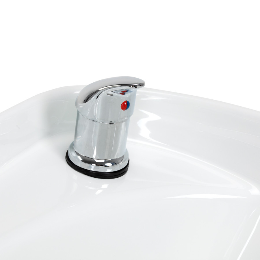 Hĺbka keramického umývadla v bielej farbe umožňuje pohodlné a efektívne vykonávanie širokej škály kaderníckych služieb, pričom zabraňuje nadmernému striekaniu vody a produktov používaných počas ošetrenia. Vďaka použitému materiálu je umývadlo odolné, odolné voči škvrnám a poškriabaniu a veľmi ľahko sa udržiava v čistote. Vhodne tvarovaná príruba a šikmé operadlo poskytujú oporu a pohodlie počas umývania vlasov a vďaka pohodlnému plastovému prekrytiu v odtieňoch čiernej farby nebude klientovi nepríjemný chlad keramického povrchu.