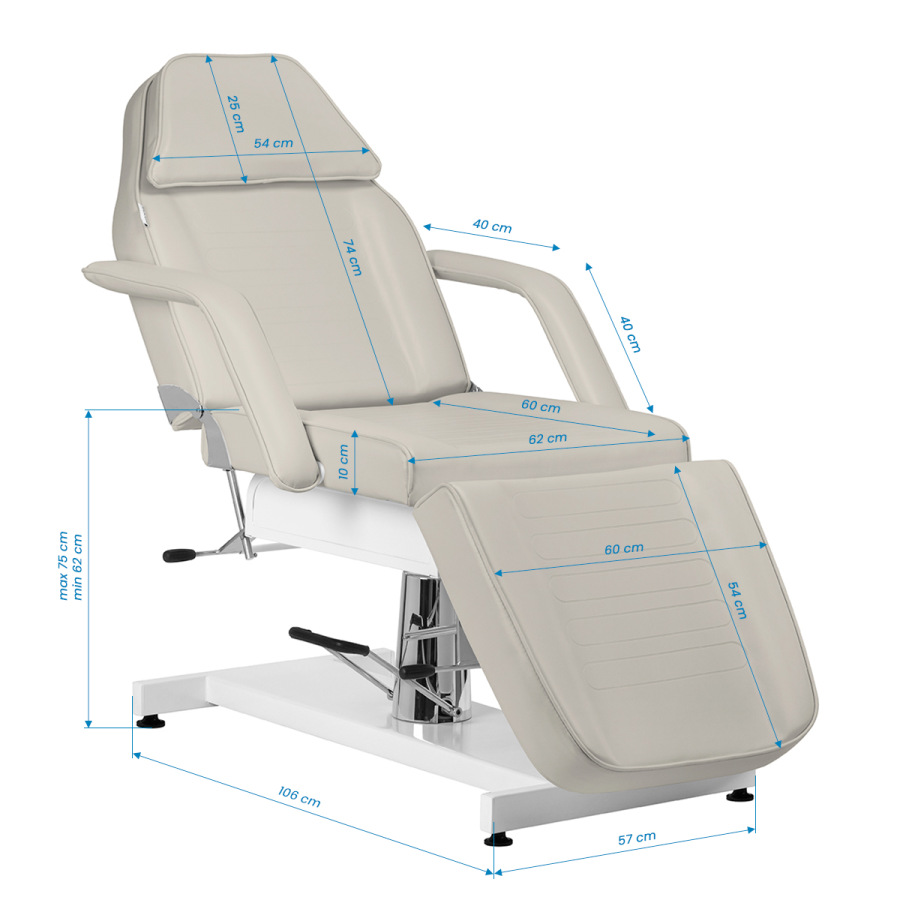 Výšku kresla možno nastaviť v rozmedzí 62-75 cm bez použitia rúk pomocou hydraulického čerpadla. Vďaka tomu môžu zariadenie pohodlne používať ľudia rôznej výšky a umožňuje prispôsobiť ho individuálnym potrebám klienta aj lekára. Použitý mechanizmus je veľmi odolný a spoľahlivý. Vďaka otvoru v opierke hlavy, ktorý je skrytý pod vhodne tvarovaným vankúšom, je kreslo ideálne aj na procedúry vykonávané na chrbte, ako sú napríklad masáže.