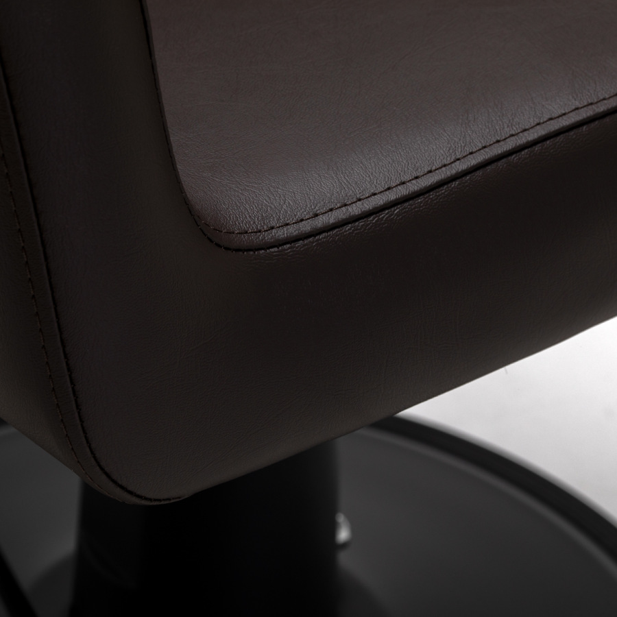Fotel fryzjerski Gabbiano Lucca łączy nowoczesną prostotę z wygodą codziennego użytkowania. Okrągła, czarna podstawa gwarantuje stabilność, a tapicerka ze skóry syntetycznej w odcieniu brązu zapewnia komfort podczas zabiegów. Trwałe, odporne na wilgoć materiały sprawiają, że model ten jest nie tylko komfortowy, ale i wyjątkowo łatwy w pielęgnacji, dzięki czemu zachowuje estetyczny wygląd na lata. Charakterystycznie wygięte na zewnątrz podłokietniki nadają fotelowi elegancki wygląd, a jednocześnie wspierają wygodną pozycję klienta. To uniwersalny model, który doskonale wpisze się zarówno w nowoczesne, jak i bardziej klasyczne aranżacje, podkreślając profesjonalny styl salonu.
