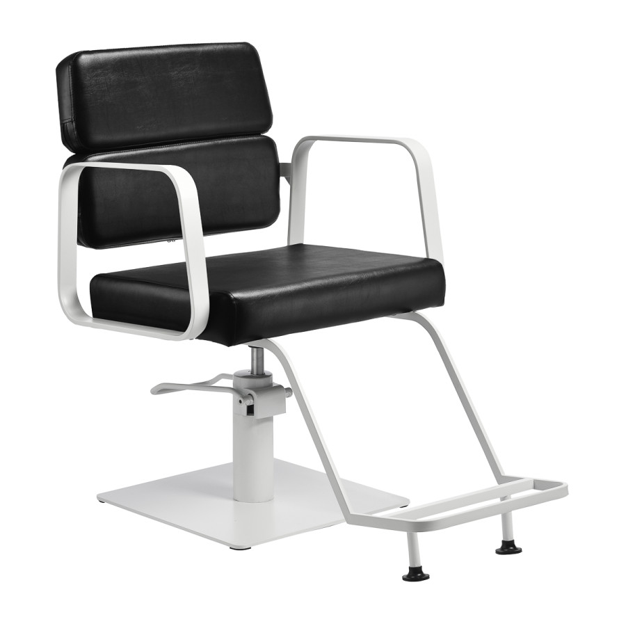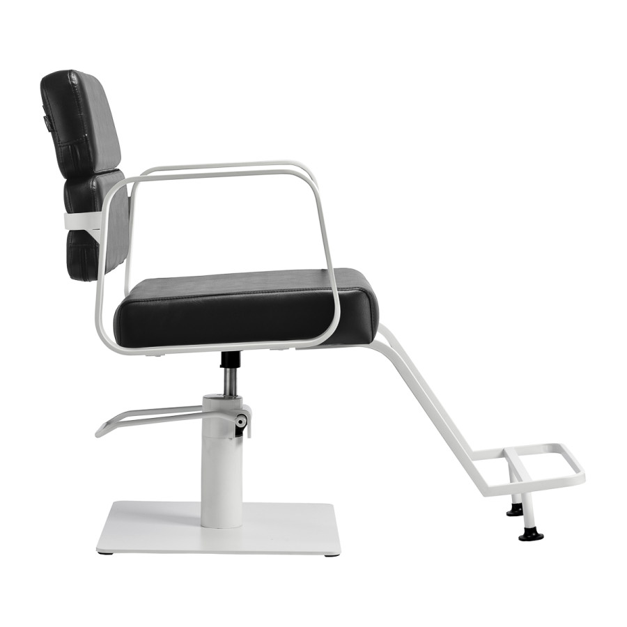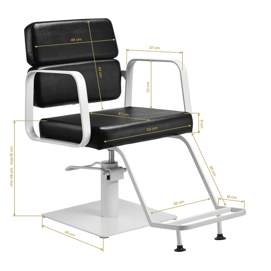 Mechanizmus úplného otáčania, ktorým je stolička vybavená, zefektívňuje a spríjemňuje prácu kaderníka. Pevná plochá základňa štvorcového tvaru zaručuje stabilitu počas používania. Hladký povrch s matnou povrchovou úpravou dodáva tomuto kúsku elegantný vzhľad a vďaka nemu sa ľahko udržiava v čistote. Pohodlné sedadlo s penovou výplňou zaručuje vysokú úroveň komfortu aj počas dlhých hodín používania. Geometrické kovové podrúčky v zlatých tónoch umožňujú správne polohovanie ramien klienta - vďaka tomu nezabára hlavu do ramien ani sa nehrbí -, čo výrazne uľahčuje precízne ošetrenie vrátane strihania vlasov. Štýlová opierka nôh určená pre tento model poskytuje stabilnú oporu pre nohy používateľa.