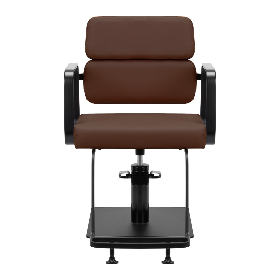Mechanizmus úplného otáčania, ktorým je stolička vybavená, zefektívňuje a spríjemňuje prácu kaderníka. Pevná plochá základňa štvorcového tvaru zaručuje stabilitu počas používania. Hladký povrch s matnou povrchovou úpravou dodáva tomuto kúsku elegantný vzhľad a vďaka nemu sa ľahko udržiava v čistote. Pohodlné sedadlo s penovou výplňou zaručuje vysokú úroveň komfortu aj počas dlhých hodín používania. Geometrické kovové podrúčky v zlatých tónoch umožňujú správne polohovanie ramien klienta - vďaka tomu nezabára hlavu do ramien ani sa nehrbí -, čo výrazne uľahčuje precízne ošetrenie vrátane strihania vlasov. Štýlová opierka nôh určená pre tento model poskytuje stabilnú oporu pre nohy používateľa.