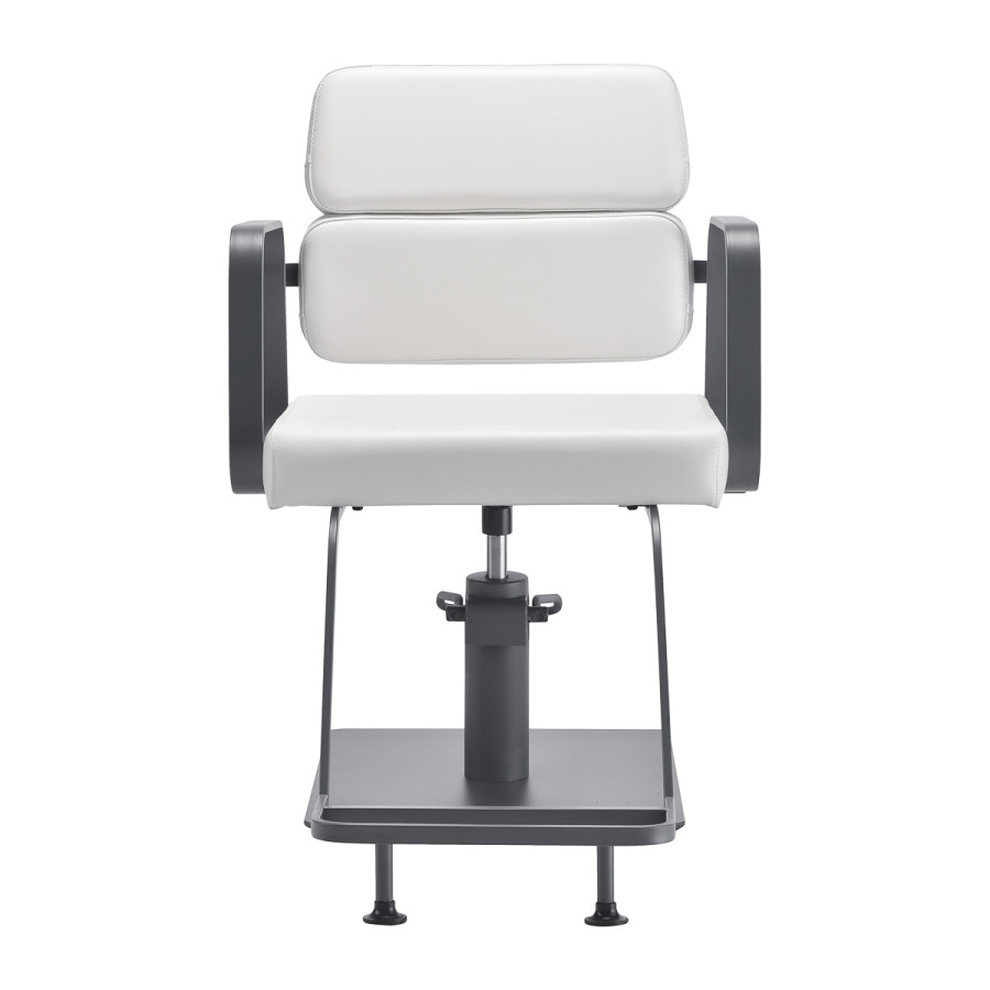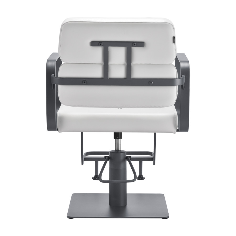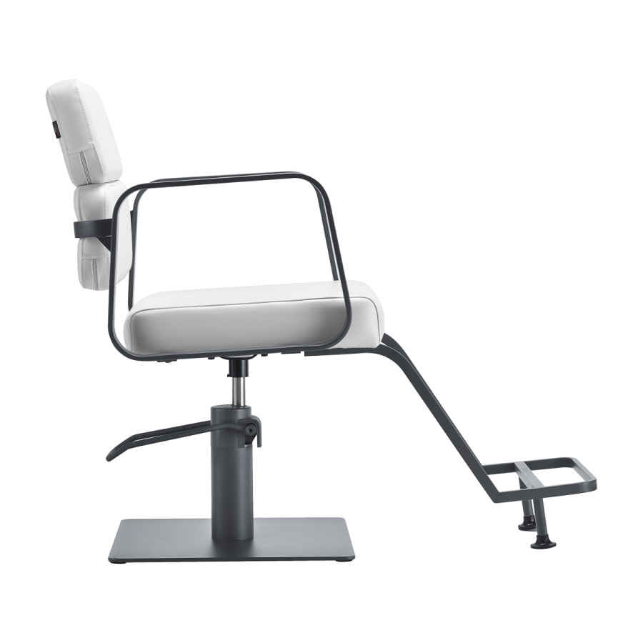 Mechanizmus úplného otáčania, ktorým je stolička vybavená, zefektívňuje a spríjemňuje prácu kaderníka. Pevná plochá základňa štvorcového tvaru zaručuje stabilitu počas používania. Hladký povrch s matnou povrchovou úpravou dodáva tomuto kúsku elegantný vzhľad a vďaka nemu sa ľahko udržiava v čistote. Pohodlné sedadlo s penovou výplňou zaručuje vysokú úroveň komfortu aj počas dlhých hodín používania. Geometrické kovové podrúčky v zlatých tónoch umožňujú správne polohovanie ramien klienta - vďaka tomu nezabára hlavu do ramien ani sa nehrbí -, čo výrazne uľahčuje precízne ošetrenie vrátane strihania vlasov. Štýlová opierka nôh určená pre tento model poskytuje stabilnú oporu pre nohy používateľa.