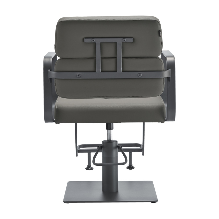 Mechanizmus úplného otáčania, ktorým je stolička vybavená, zefektívňuje a spríjemňuje prácu kaderníka. Pevná plochá základňa štvorcového tvaru zaručuje stabilitu počas používania. Hladký povrch s matnou povrchovou úpravou dodáva tomuto kúsku elegantný vzhľad a vďaka nemu sa ľahko udržiava v čistote. Pohodlné sedadlo s penovou výplňou zaručuje vysokú úroveň komfortu aj počas dlhých hodín používania. Geometrické kovové podrúčky v zlatých tónoch umožňujú správne polohovanie ramien klienta - vďaka tomu nezabára hlavu do ramien ani sa nehrbí -, čo výrazne uľahčuje precízne ošetrenie vrátane strihania vlasov. Štýlová opierka nôh určená pre tento model poskytuje stabilnú oporu pre nohy používateľa.