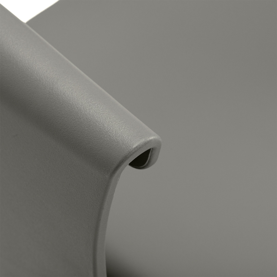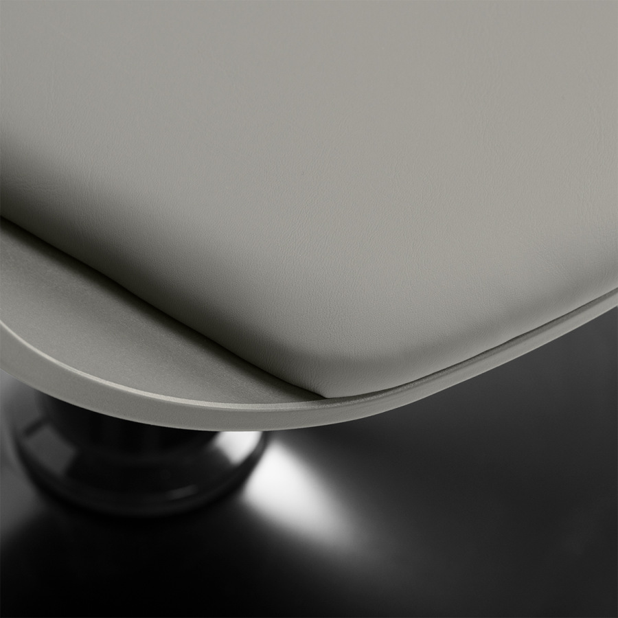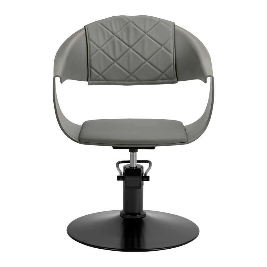 Wytrzymała konstrukcja z tworzywa sztucznego w odcieniach szarości zapewnia trwałość. Zastosowane materiały sprawiają, że sprzęt jest komfortowy w użytkowaniu, odporny na wilgoć oraz łatwy do czyszczenia. Okrągła podstawa w odcieniach czerni gwarantuje stabilność i wytrzymałość. Minimalistyczna szarość w połączeniu z estetycznymi przeszyciami oraz czernią podstawy sprawia, że fotel doskonale komponuje się z różnymi stylami wnętrz salonów fryzjerskich, wprowadzając elegancki i nowoczesny akcent.