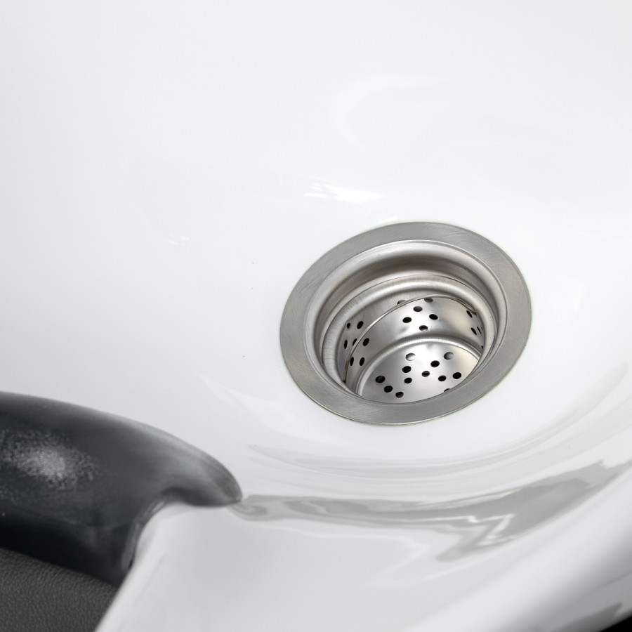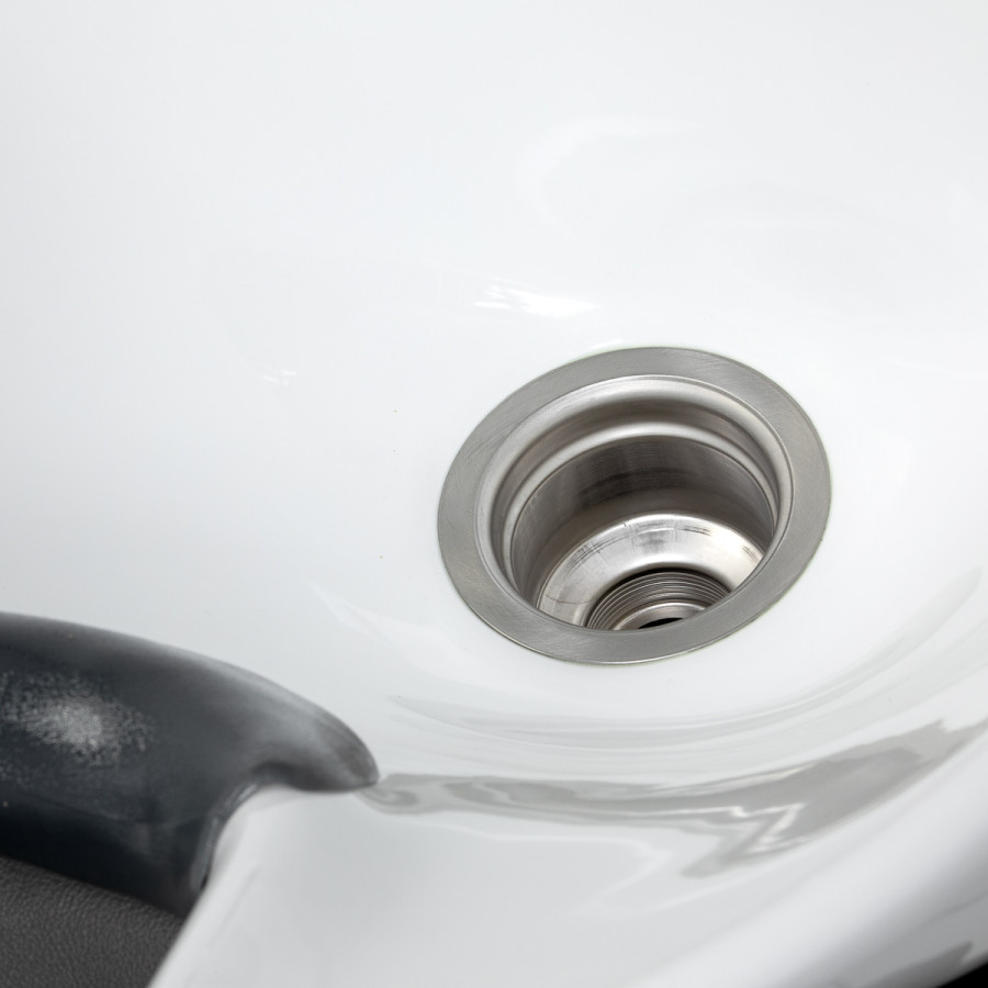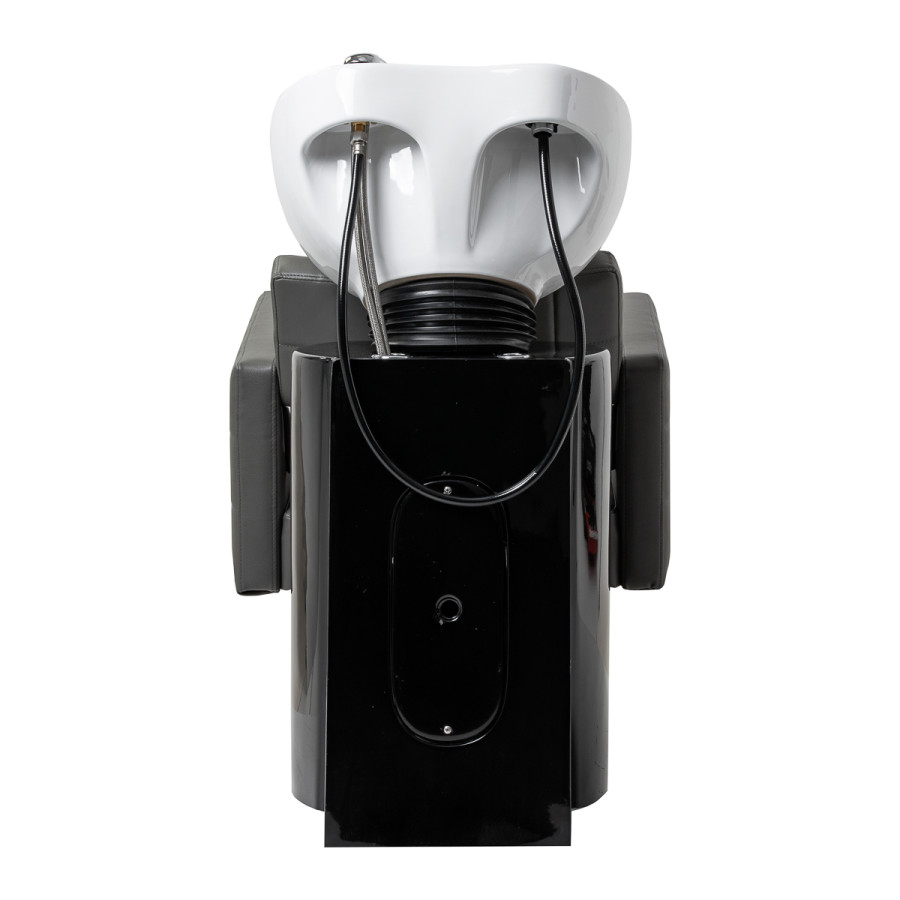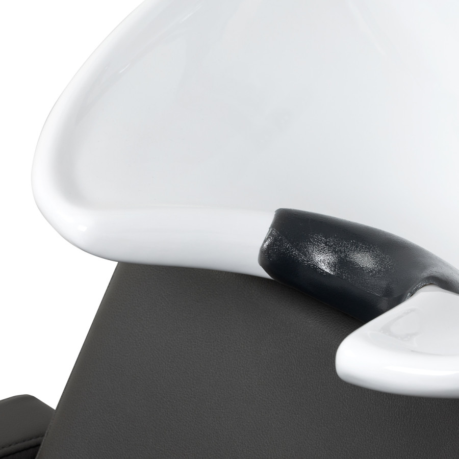 Hlboká keramická misa v odtieňoch bielej účinne obmedzuje striekajúcu vodu a prípravky používané počas ošetrenia. To podporuje pohodlné a presné vykonávanie rôznych kaderníckych služieb. Pohyblivá konštrukcia misky umožňuje jednoduché nastavenie uhla podľa individuálnych potrieb. Použitý materiál je trvanlivý, odolný voči zmene farby a poškriabaniu a ľahko sa udržiava v čistote. Vhodne tvarovaná príruba poskytuje pohodlnú oporu hlave počas umývania, zatiaľ čo komfortný plastový prekryt v čiernych tónoch eliminuje pocit chladu keramického povrchu.