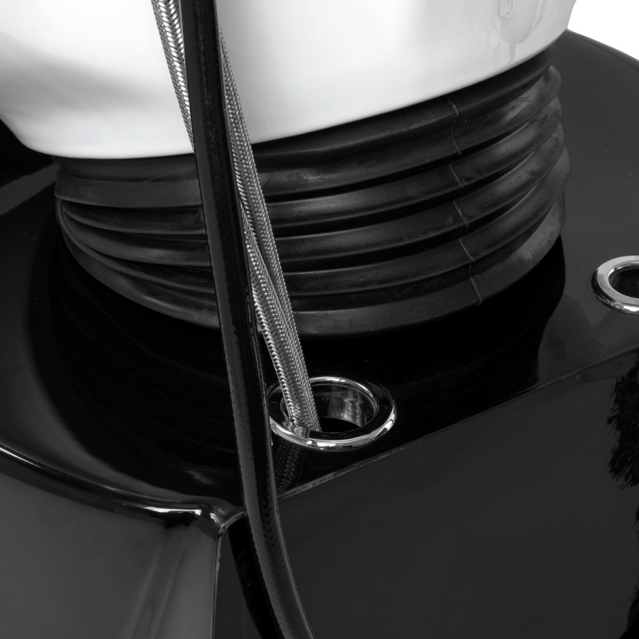 Umývadlo je vybavené zmiešavacou batériou na pohodlné používanie teplej a studenej vody a jednoduché nastavenie teploty. Praktické miesto na odloženie sprchovej rúčky uľahčuje organizáciu práce a udržiavanie poriadku na pracovisku. Zátka so sitkom vám umožní kontrolovať prietok vody pri zachovaní vysokých hygienických štandardov. Súčasťou balenia je kompletná batéria - batéria, sprchová rukoväť a vyhradené hadice, ktoré vytvárajú súpravu pripravenú na použitie. Vodovodná prípojka bola umiestnená vo vnútri základne umývačky, čo umožňuje estetické skrytie inštalácie. V základni umývačky sú miesta na jej priskrutkovanie k zemi - toto riešenie zvyšuje stabilitu celej konštrukcie. Kombinácia funkčných riešení a premyslených detailov sa premieta do komfortu každodennej práce v kaderníckom salóne.