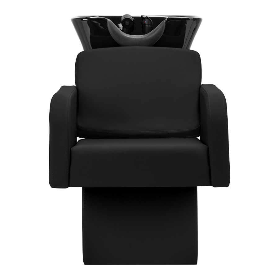 Keramická misa v odtieňoch čiernej farby s moderným tvarom a vhodnou hĺbkou účinne zabraňuje striekaniu vody a produktov používaných počas ošetrenia, čo umožňuje pohodlné a efektívne vykonávanie širokej škály služieb. Správne vyprofilovaný golier a šikmé operadlo poskytujú pohodlie a oporu počas umývania vlasov, zatiaľ čo čierny plastový kryt chráni klienta pred studeným keramickým povrchom, čím zabezpečuje príjemný zážitok počas ošetrenia.