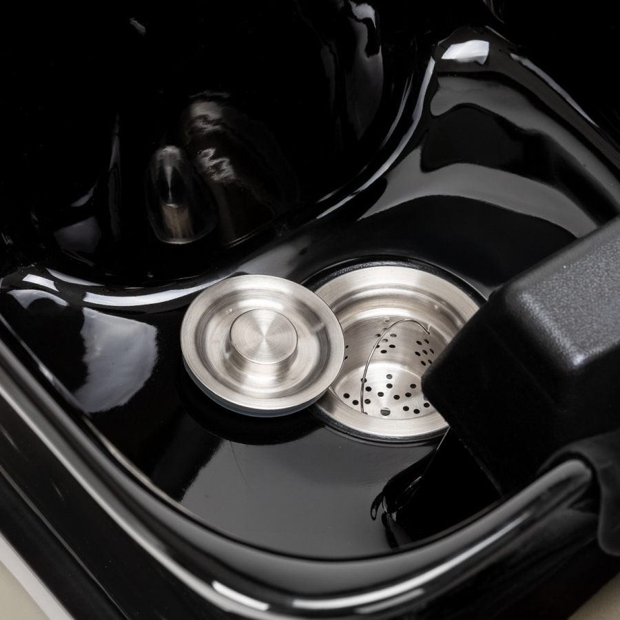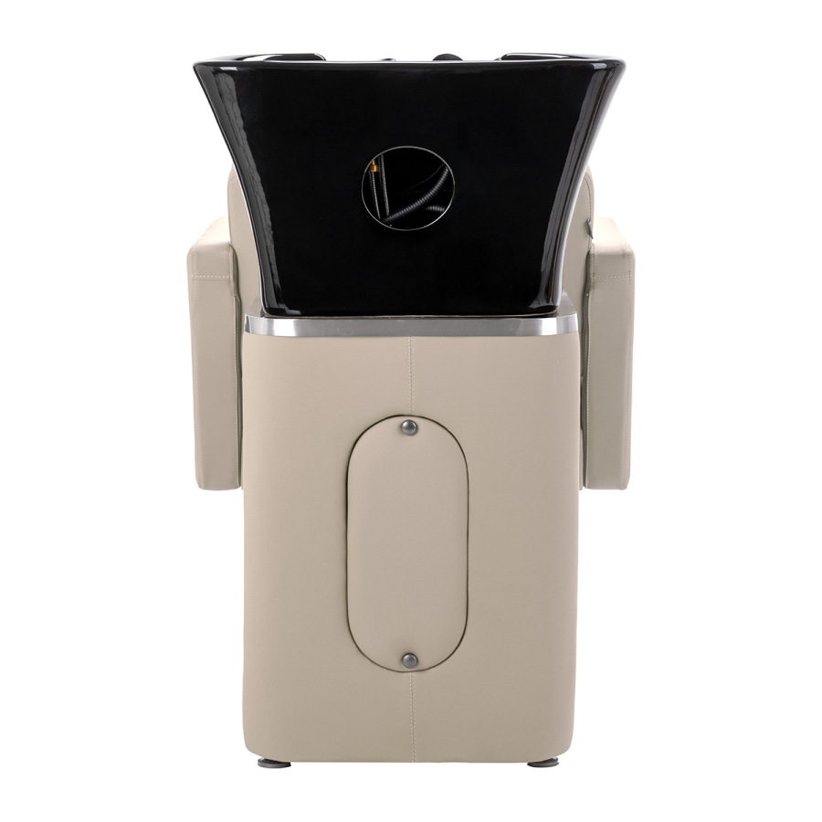 Keramická misa v odtieňoch čiernej farby s moderným tvarom a vhodnou hĺbkou účinne zabraňuje striekaniu vody a produktov používaných počas ošetrenia, čo umožňuje pohodlné a efektívne vykonávanie širokej škály služieb. Správne vyprofilovaný golier a šikmé operadlo poskytujú pohodlie a oporu počas umývania vlasov, zatiaľ čo čierny plastový kryt chráni klienta pred studeným keramickým povrchom, čím zabezpečuje príjemný zážitok počas ošetrenia.