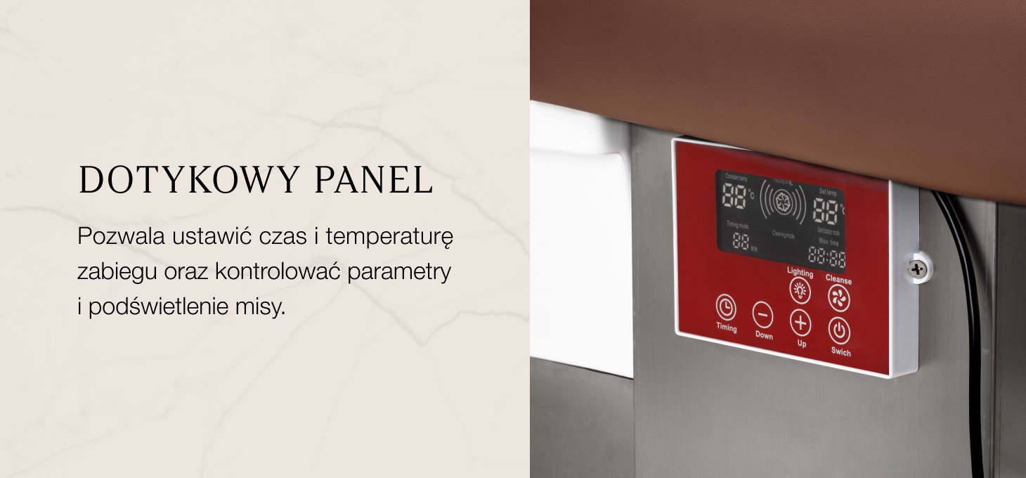 Intuicyjny panel dotykowy umożliwia pełną kontrolę nad parametrami zabiegu, zapewniając wygodę użytkowania. Umożliwia regulację czasu pracy oraz temperatury wody, a także monitorowanie ich aktualnych wartości. Dzięki wbudowanemu wyświetlaczowi możesz w każdej chwili sprawdzić, ile czasu urządzenie już pracuje. Panel pozwala również na włączenie funkcji światłoterapii, czyli podświetlenia misy, tworząc atmosferę relaksu i luksusu. Dodatkowo, urządzenie do terapii parowej wyposażone jest w pilota umożliwiającego wygodną obsługę na odległość.