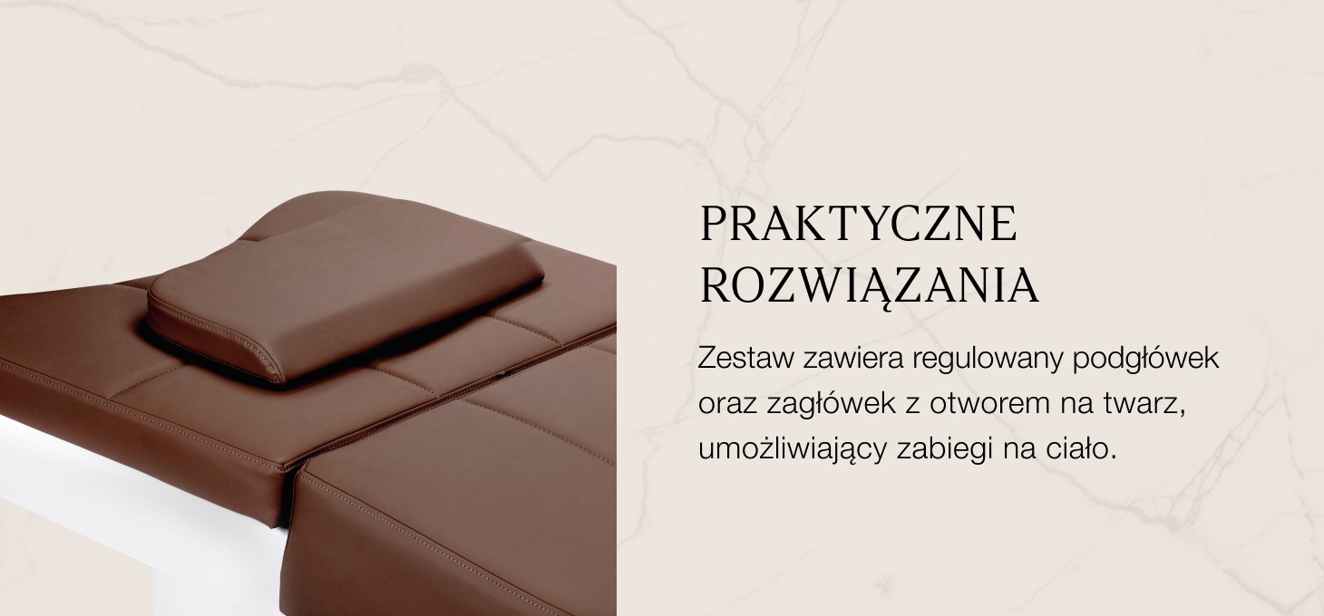 Regulowany podgłówek z możliwością wysuwania i zmiany kąta nachylenia zapewnia idealne dopasowanie do potrzeb użytkownika, zwiększając wygodę podczas zabiegów. W zestawie znajdują się również ergonomiczne poduszki, w tym zagłówek z otworem na twarz, który umożliwia wykonywanie nie tylko procedur pielęgnacyjnych skóry głowy, ale także masaży oraz różnorodnych zabiegów na ciało i twarz. Dzięki tym praktycznym rozwiązaniom, leżanka staje się wszechstronnym elementem wyposażenia salonów beauty & wellness, gwarantując komfort oraz efektywność każdej terapii.