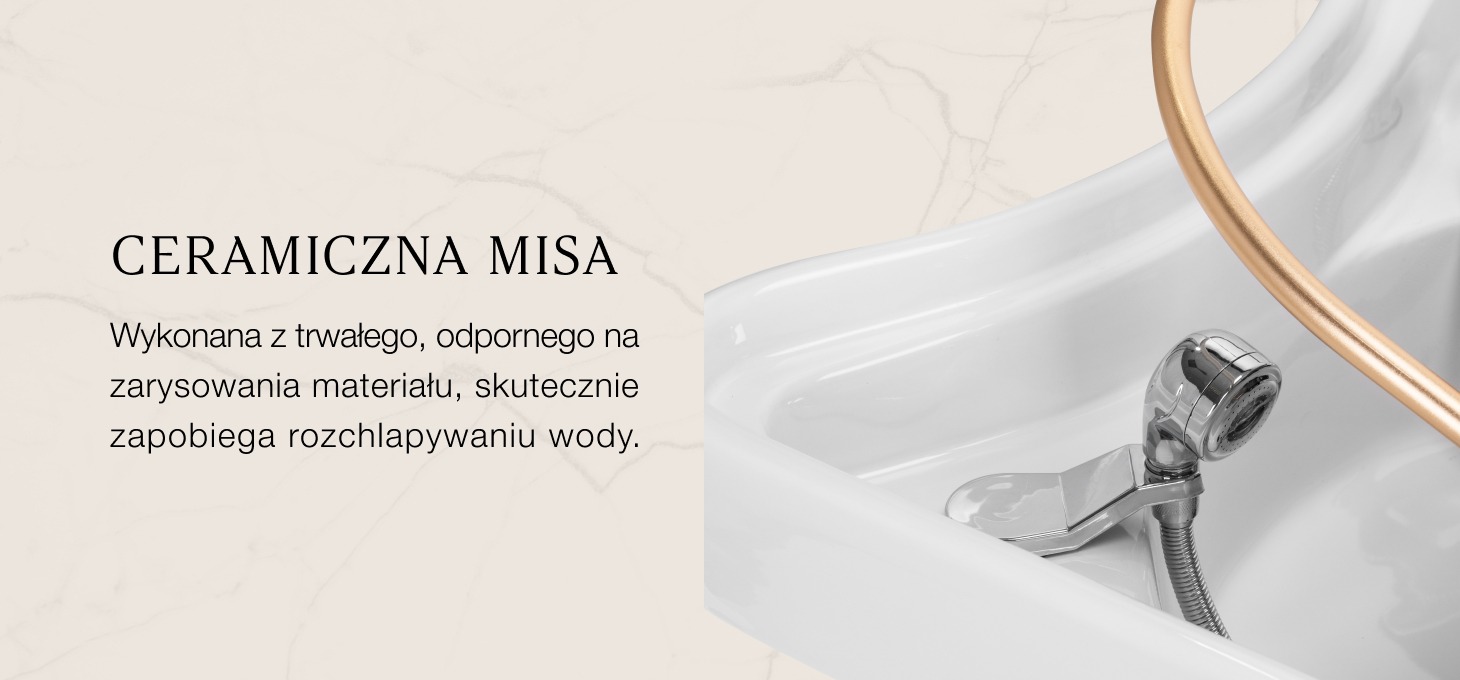 Głęboka ceramiczna misa w odcieniach bieli skutecznie zapobiega rozchlapywaniu wody i produktów stosowanych podczas zabiegów, zapewniając czystość oraz wygodę pracy. Jej unikalne wygięcie nie tylko ułatwia dostęp osobie wykonującej usługę, ale także dodaje myjni eleganckiego, nowoczesnego charakteru. Wykonana z trwałego materiału misa jest odporna na przebarwienia, zarysowania i uszkodzenia, a jej gładka powierzchnia sprawia, że utrzymanie czystości jest wyjątkowo łatwe. Połączenie funkcjonalności i estetyki podnosi standard każdej profesjonalnej przestrzeni.
