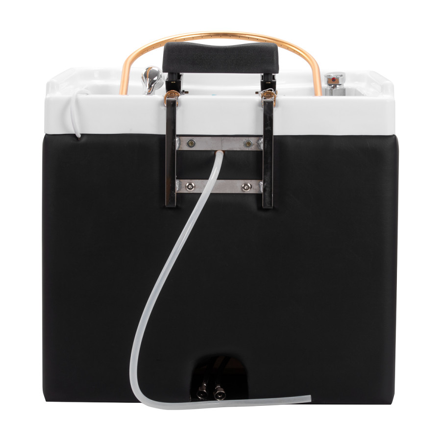 Umývačka je vybavená zmiešavacou batériou, ktorá vám umožňuje jednoducho nastaviť teplotu podľa vašich preferencií. Vyhradený priestor pre sprchovú rukoväť uľahčuje prácu a pochrómovaná zátka so špeciálnym sitkom umožňuje regulovať prietok vody a dodržiavať hygienické normy salónu. Vodovodná prípojka je ukrytá vo vnútri krytu za krytom z pružného materiálu, čo umožňuje esteticky skryť vodovodné potrubie a zachovať jednotný, profesionálny vzhľad zariadenia.