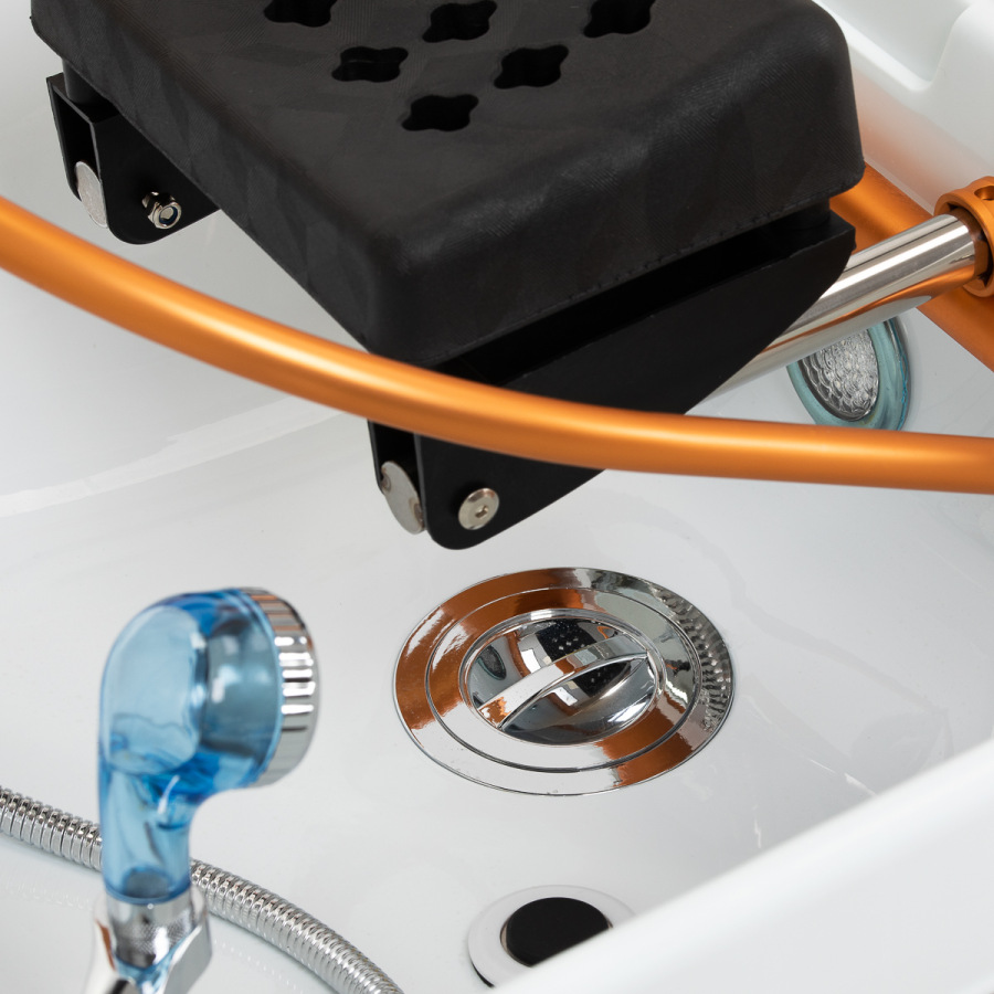 Umývacia jednotka je vybavená zmiešavacou batériou, ktorá umožňuje presné nastavenie teploty vody podľa potrieb klienta. Vyhradený priestor pre sprchovú hlavicu zvyšuje účinnosť, zatiaľ čo pochrómovaná zátka so špeciálnym sitkom zabezpečuje reguláciu prietoku vody a udržiava vysokú úroveň hygieny. Vodovodná prípojka je umiestnená vo vnútri podstavca, za textíliou, čo esteticky zakrýva vodovodné potrubie a dodáva celému zariadeniu elegantný vzhľad. Ergonomicky tvarované lôžko zaisťuje pohodlie počas rôznych kozmetických procedúr. Jednotku dopĺňa praktický puf, ktorý zvyšuje pohodlie personálu a zvyšuje funkčnosť jednotky. Vďaka týmto vlastnostiam je umývacia jednotka ideálna pre kadernícke aj SPA salóny.