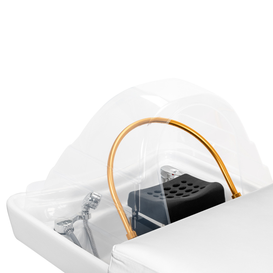 Nastaviteľná opierka hlavy s možnosťou rozšírenia a nastavenia uhla sklonu zaisťuje dokonalé prispôsobenie používateľovi, čím zvyšuje pohodlie počas ošetrenia. Súprava obsahuje ergonomické vankúše vrátane opierky hlavy s otvorom na tvár, ktorá umožňuje nielen ošetrenie pokožky hlavy, ale aj masáže a rôzne ošetrenia tela a tváre. Zabudované umývadlo rozširuje funkčnosť ležadla a umožňuje ošetrenie nôh vrátane pedikúry. Toto riešenie ešte viac umocňuje pocit uvoľnenia a umožňuje ešte komplexnejšiu ponuku služieb. Tieto praktické funkcie robia z ležadla univerzálne zariadenie pre salóny krásy a wellness, ktoré zabezpečuje pohodlie klientov aj účinnosť vykonávaných procedúr.