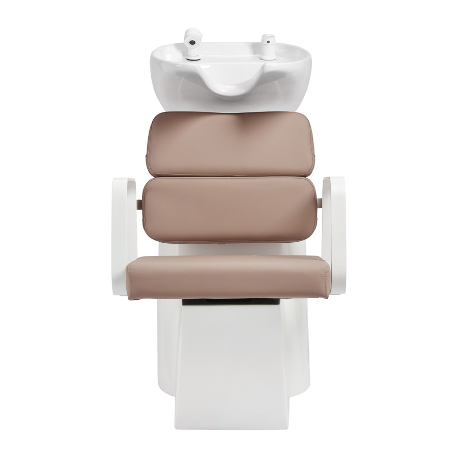 Profilované kreslo poskytuje správnu bedrovú oporu, a teda vysoký komfort používania. Kovové podrúčky v odtieňoch bielej farby s geometrickým tvarom umožňujú správne polohovanie ramien klienta. Čalúnenie z odolnej peny odolnej voči deformáciám a čalúnenie z na dotyk príjemnej syntetickej kože v odtieňoch béžovej farby zabezpečujú odolnosť nábytku, jednoduché čistenie a pohodlné používanie na dlhý čas. Originálny, elegantný dizajn umývačky dodáva interiéru jedinečný nádych. Súčasťou balenia je kompletné príslušenstvo v odtieňoch bielej farby vrátane batérie, sprchovej rukoväte a vyhradených hadíc, ktoré vám poskytnú kompletnú sadu nástrojov na prácu.