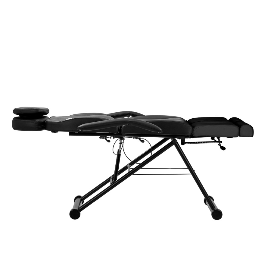 Základňa kresla má pevnú výšku, takže sedadlo je v rovnakej úrovni, čo by malo zabezpečiť pohodlie počas používania. Pevný kovový rám v odtieňoch čiernej farby poskytuje potrebnú stabilitu počas používania. Opierka hlavy, ktorá sa vysúva približne o 15 cm, poskytuje vynikajúcu oporu hlavy bez ohľadu na výšku klienta. To umožňuje voľne vykonávať rôzne ošetrenia , okrem iného v oblasti kozmetiky, fyzioterapie alebo tetovania.