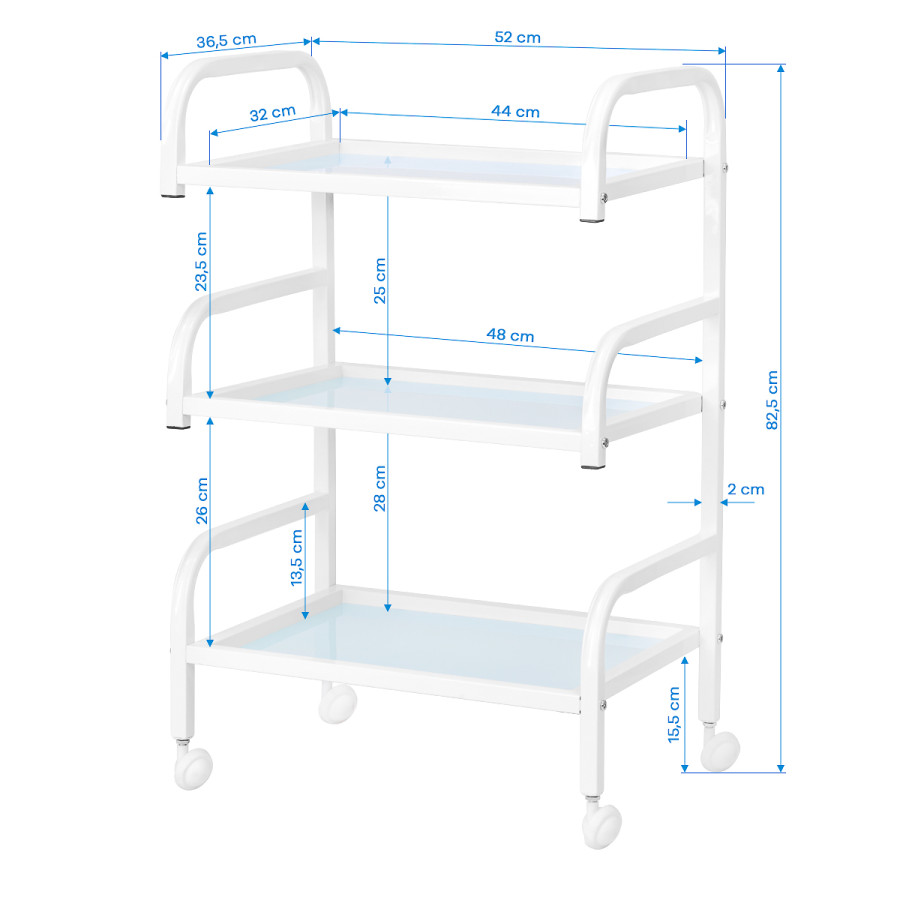 Rám z odolného bieleho hliníka a sklenené police vytvárajú modernú a estetickú jednotku, ktorá sa ľahko udržiava v čistote. Štyri kolieska zabezpečujú mobilitu na jednoduchú organizáciu pracovného priestoru, zatiaľ čo robustné materiály zaručujú stabilitu a trvanlivosť používania.