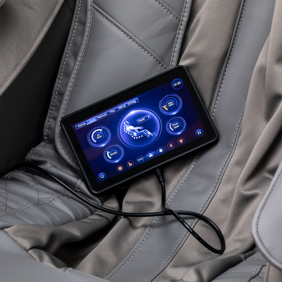 Ovládací panel vám umožňuje ľahko prispôsobiť masáž vašim individuálnym potrebám. Pre väčšie pohodlie ho môžete umiestniť do držiaka na pravom podrúčniku alebo držať v rukách. Na obrazovke sa jasne zobrazujú všetky kľúčové informácie – časti tela, ktoré sa práve masírujú, intenzita masáže, dĺžka trvania a zvolený program. Ovládací panel umožňuje prepínať medzi automatickým a manuálnym režimoma aktivovať hlasové ovládanie, čím sa zvyšuje komfort používania. Môžete ho použiť na pohodlný výber z dostupných masážnych režimov, nastavenie intenzity, nastavenie kresla a presné nastavenie dĺžky masáže v 5-minútových intervaloch (5, 10, 15, 20, 25 alebo 30 minút), čím zabezpečíte ideálnu dĺžku masáže prispôsobenú potrebám používateľa.