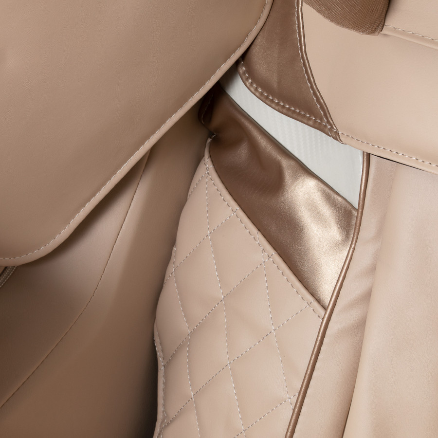 Mäkká imitácia kože v béžových odtieňoch poskytuje výnimočný komfort a jednoduché čistenie. Materiál je nielen estetický, ale je aj odolný voči vlhkosti, čo prispieva k jeho funkčnosti. Vonkajšie prvky v ružovozlatej farbe v kombinácii so štruktúrovaným povrchom v tónoch bielej farby dodávajú kreslu moderný, štýlový vzhľad. Vďaka kompaktným tvarom a tlmenej farebnosti model harmonicky zapadne do rôznych interiérových prostredí. Sakura Prime 108 je vynikajúcou voľbou pre tých, ktorí hľadajú každodenný relax - najmä po intenzívnom dni alebo náročnom fyzickom výkone.