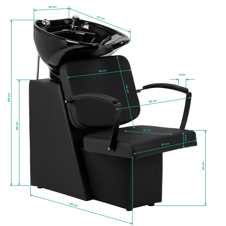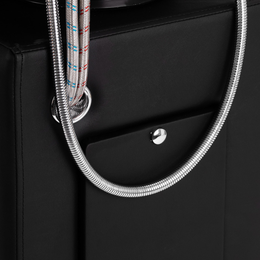 Ergonomicznie wyprofilowany fotel z trwałym wypełnieniem piankowym zapewnia wysoki komfort użytkowania. Subtelnie wygięte, częściowo tapicerowane podłokietniki umożliwiają prawidłowe ułożenie barków i stanowią atrakcyjny element wizualny. Wygodne oparcie gwarantuje stabilne podparcie pleców i odpowiednią pozycję podczas zabiegu. Czarna tapicerka w połączeniu z dekoracyjnymi elementami metalowymi nadaje całości ponadczasowy, elegancki charakter. Zastosowane materiały wyróżniają się trwałością oraz łatwością utrzymania w czystości. Oryginalna forma myjni nadaje wnętrzu niepowtarzalny charakter. W zestawie znajduje się kompletna armatura, obejmująca baterię, słuchawkę prysznicową oraz dedykowane węże, zapewniające pełną gotowość do pracy.