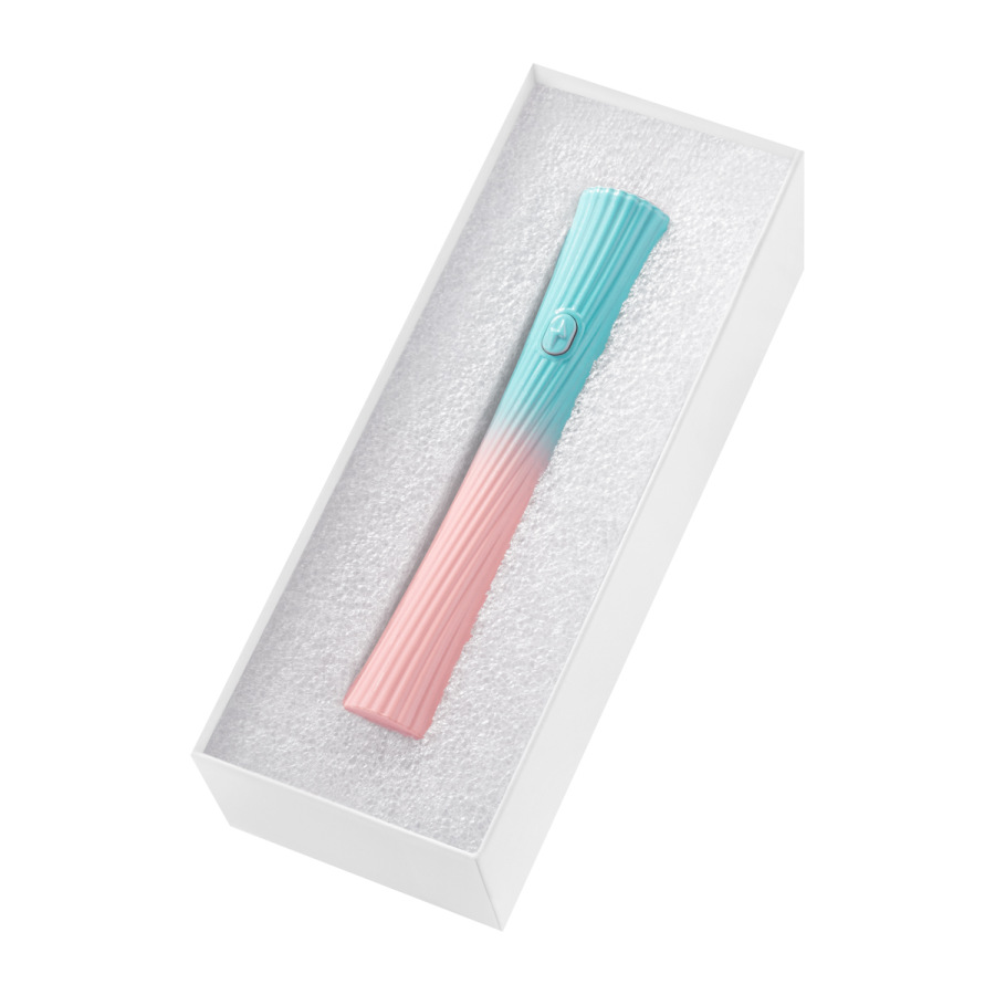 Štíhly, predĺžený tvar s ergonomickými proporciami a dekoratívnym, drážkovaným povrchom zaisťuje bezpečný úchop a moderný vzhľad. Jemný farebný prechod v odtieňoch tyrkysovej a pastelovej ružovej dodáva zariadeniu ľahkosť.