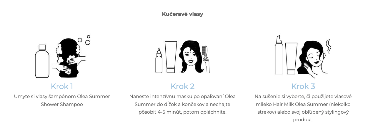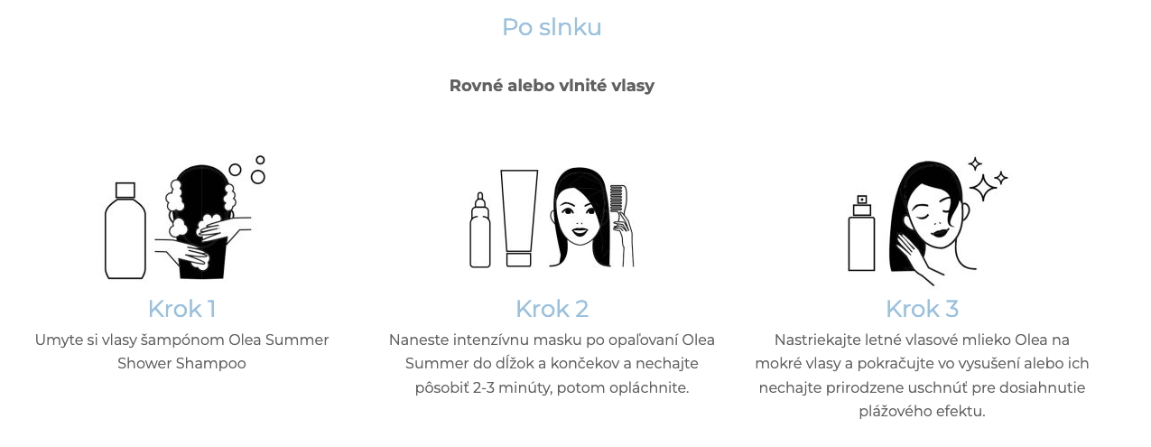 Pred pobytom na slnku alebo pred plávaním rovnomerne nastriekajte na vlasy. Vďaka ľahkej textúre vlasy nezlepí ani nezmastí. Po pobytu na slnku umyte vlasy jemným šampónom — ideálne OLEA Summer Shampoo.