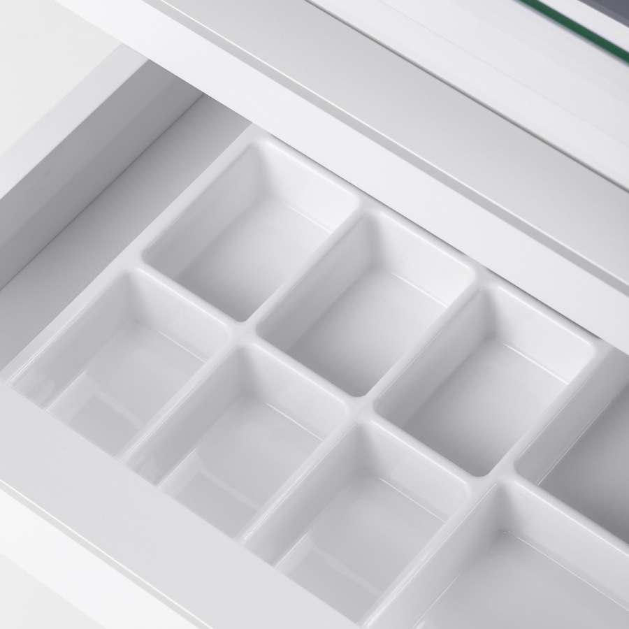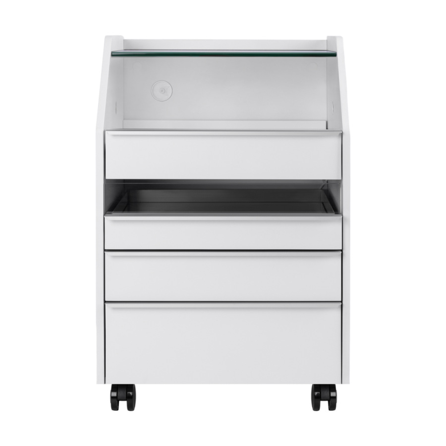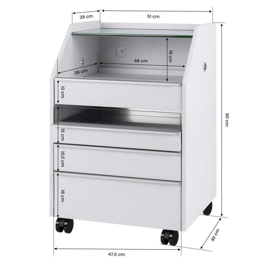 Úzka horná sklenená polica umožňuje pohodlné ukladanie najčastejšie používaného príslušenstva. Skrinka je vybavená štyrmi zásuvkami rôznych veľkostí, čo uľahčuje usporiadané ukladanie nástrojov a kozmetických výrobkov. Zrkadlové dno jednej zo zásuviek a špeciálny vnútorný organizér uľahčujú lepšiu organizáciu nástrojov, zabezpečujú rýchly prístup k nevyhnutnému príslušenstvu a zvyšujú komfort počas ošetrení. Výška hornej otvorenej zásuvky umožňuje umiestniť nevyhnutné vybavenie, ako je fréza s absorbérom.
