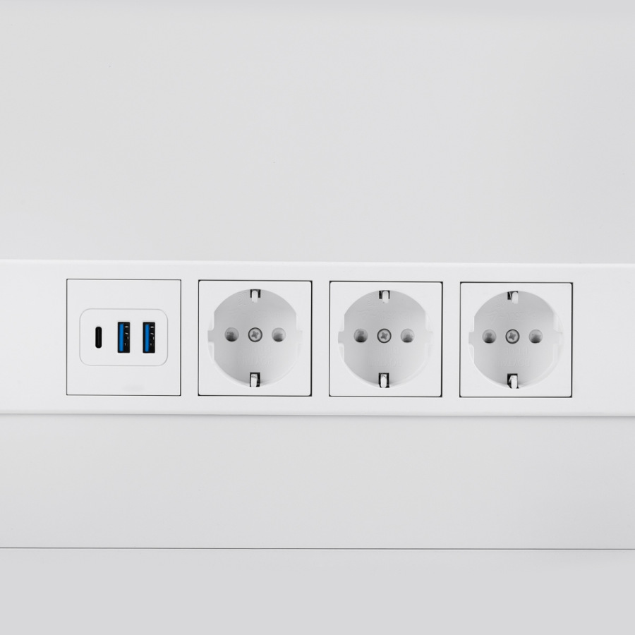 Asistent má zadný panel s tromi sieťovými zásuvkami, dvoma USB portmi a jedným USB-C portom, čo umožňuje pohodlné pripojenie rôznych typov zariadení. Prechodky káblov umiestnené v stenách v blízkosti hornej zásuvky pomáhajú udržiavať poriadok. Integrovaný držiak zväčšovacej lampy umožňuje bezpečné upevnenie ramena lampy v blízkosti ošetrovanej oblasti bez zabratia miesta na pracovnej doske, čo prispieva k presnému osvetleniu a ergonomickej práci.