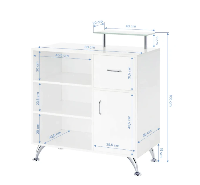 Napriek kompaktným rozmerom je recepcia veľmi priestranná. Vo vnútri nájdete skrinku, zásuvku a tri úložné police, ktoré vám umožnia udržať v recepcii poriadok a mať všetky dokumenty, formuláre a pomôcky vždy po ruke.