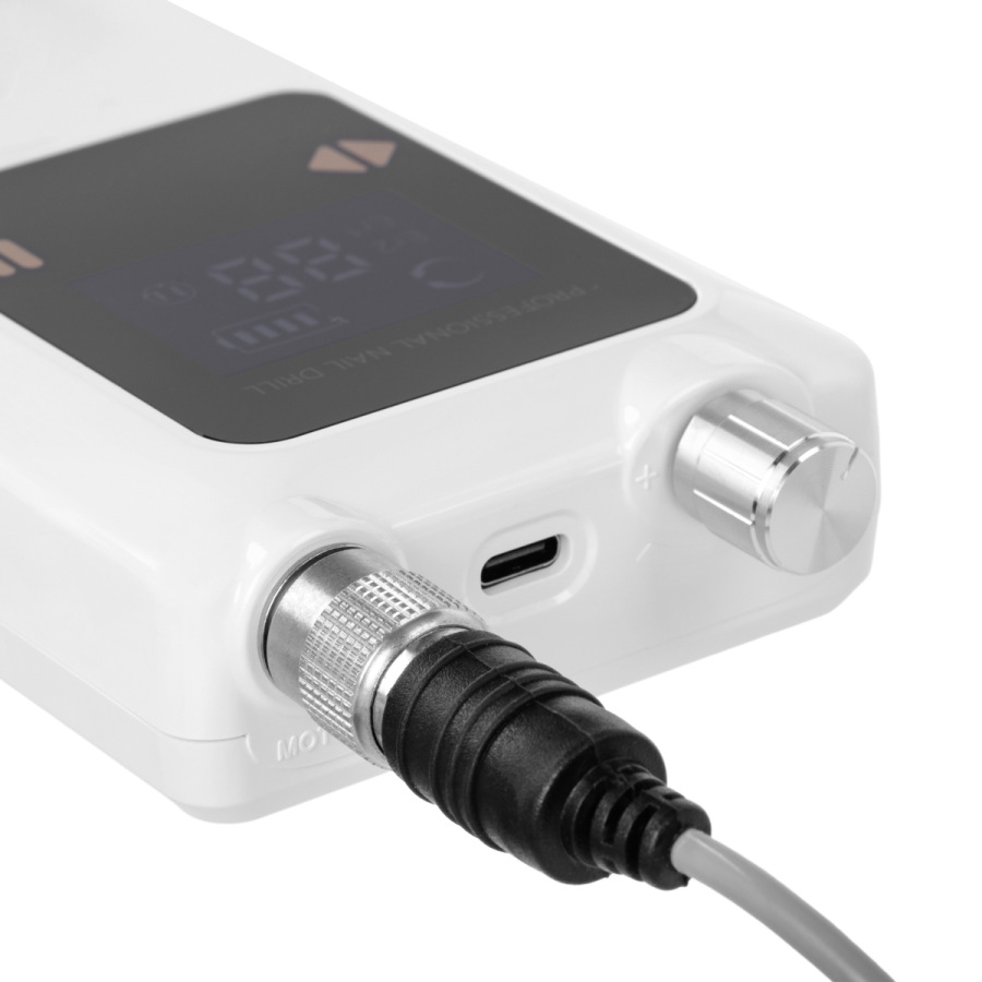 Wbudowany akumulator o pojemności 2000 mAh umożliwia pracę przez nawet 9 godzin na jednym ładowaniu. Frezarka działa cicho, co eliminuje drażniący hałas i zapewnia komfort zarówno osobie wykonującej zabieg, jak i klientom. Dodatkowo urządzenie zostało zaprojektowane z myślą o ergonomii – wygodne rozmieszczenie przycisków oraz intuicyjna obsługa sprawiają, że każdy zabieg przebiega płynnie.