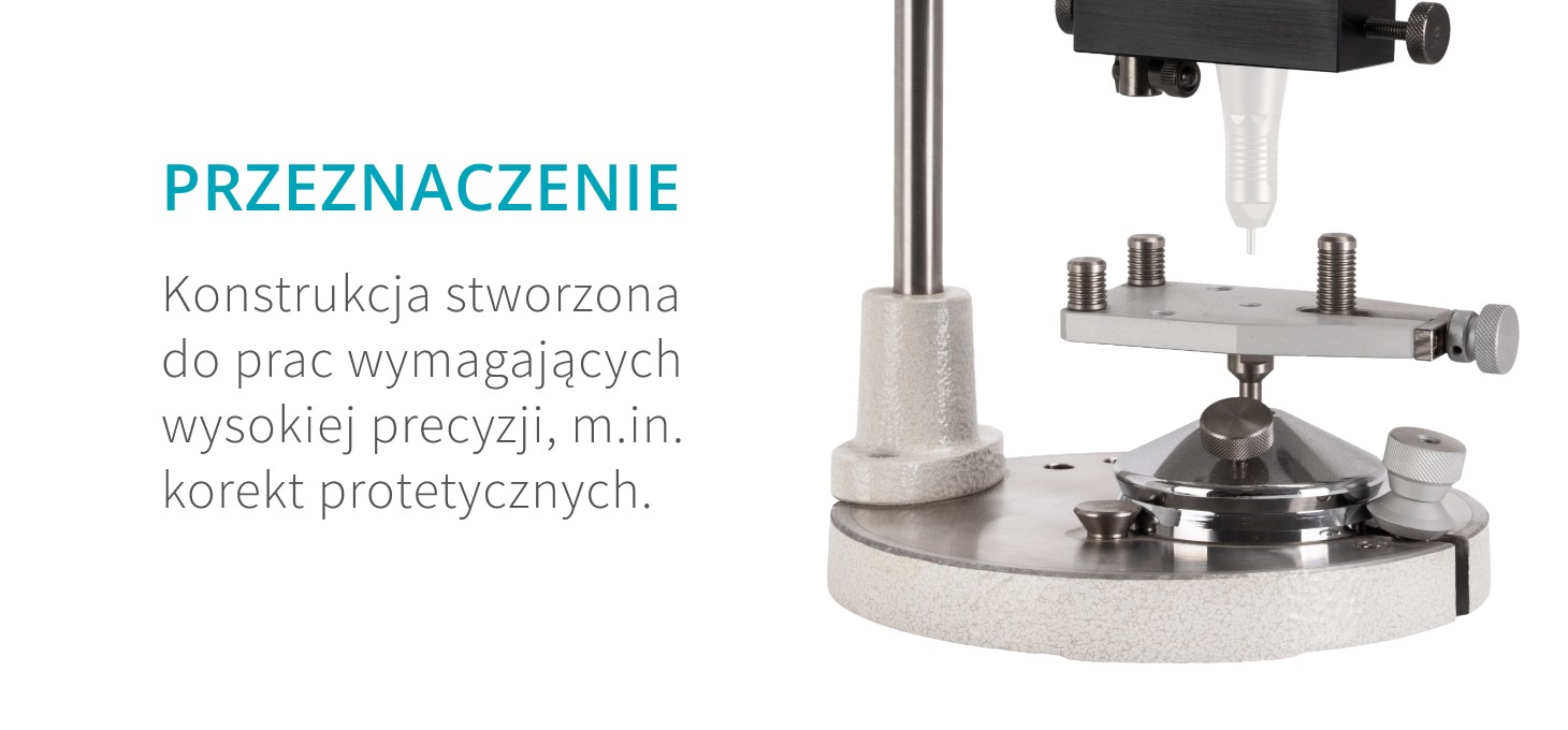 Marathon 103 łączy masywną, stabilną konstrukcję z precyzyjnymi nastawami ramienia i stołu modelowego, co sprawia, że idealnie sprawdza się w powtarzalnych pracach z frezarką oraz przy korektach protetycznych. Zestaw obejmuje uchwyt na rękojeść oraz komplet pinów narzędziowych. Konstrukcja metalowa zapewnia wysoką trwałość, a konserwacja ogranicza się do czyszczenia miękką ściereczką z detergentem i dezynfekantem.
