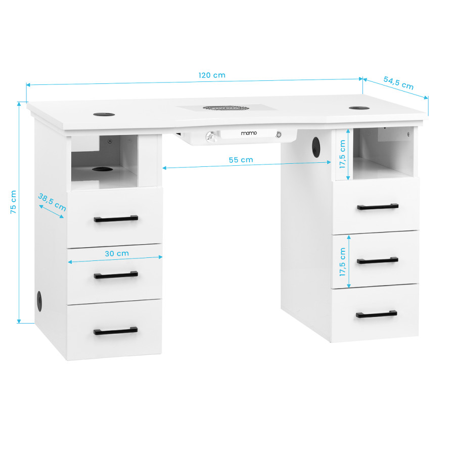 Skrinky na oboch stranách s tromi priestrannými zásuvkami uľahčujú organizáciu a pomáhajú udržiavať poriadok v najpotrebnejších kozmetických prípravkoch a nástrojoch. Vďaka tomu máte všetko potrebné vždy po ruke, čo podporuje plynulú a efektívnu prácu. Otvorené police hneď nad zásuvkami poskytujú ďalší priestor - ideálny na spotrebiče alebo často používané predmety. Stôl bol vybavený špeciálnymi otvormi a káblovými priechodkami, ktoré umožňujú estetické a úhľadné vedenie káblov od zariadení.