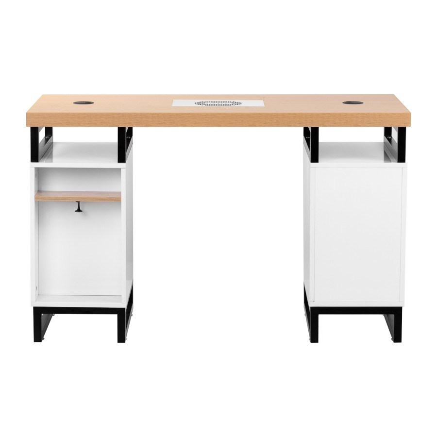 Stôl je vybavený dvoma funkčnými skrinkami s priestrannými zásuvkami - na ľavej strane sú štyri a na pravej strane dve a jedna väčšia, ideálna na veľké príslušenstvo alebo spotrebiče. Toto usporiadanie uľahčuje udržiavanie poriadku a rýchly prístup k potrebným nástrojom. Otvorené police nad zásuvkami sú ideálne na uloženie spotrebičov alebo najčastejšie používaného náčinia. Špeciálne káblové priechodky a otvory umožňujú viesť káble estetickým spôsobom, čím zvyšujú komfort práce a udržiavajú poriadok na stole. Na zadnej strane stola je k dispozícii praktický vešiak a malá polička.